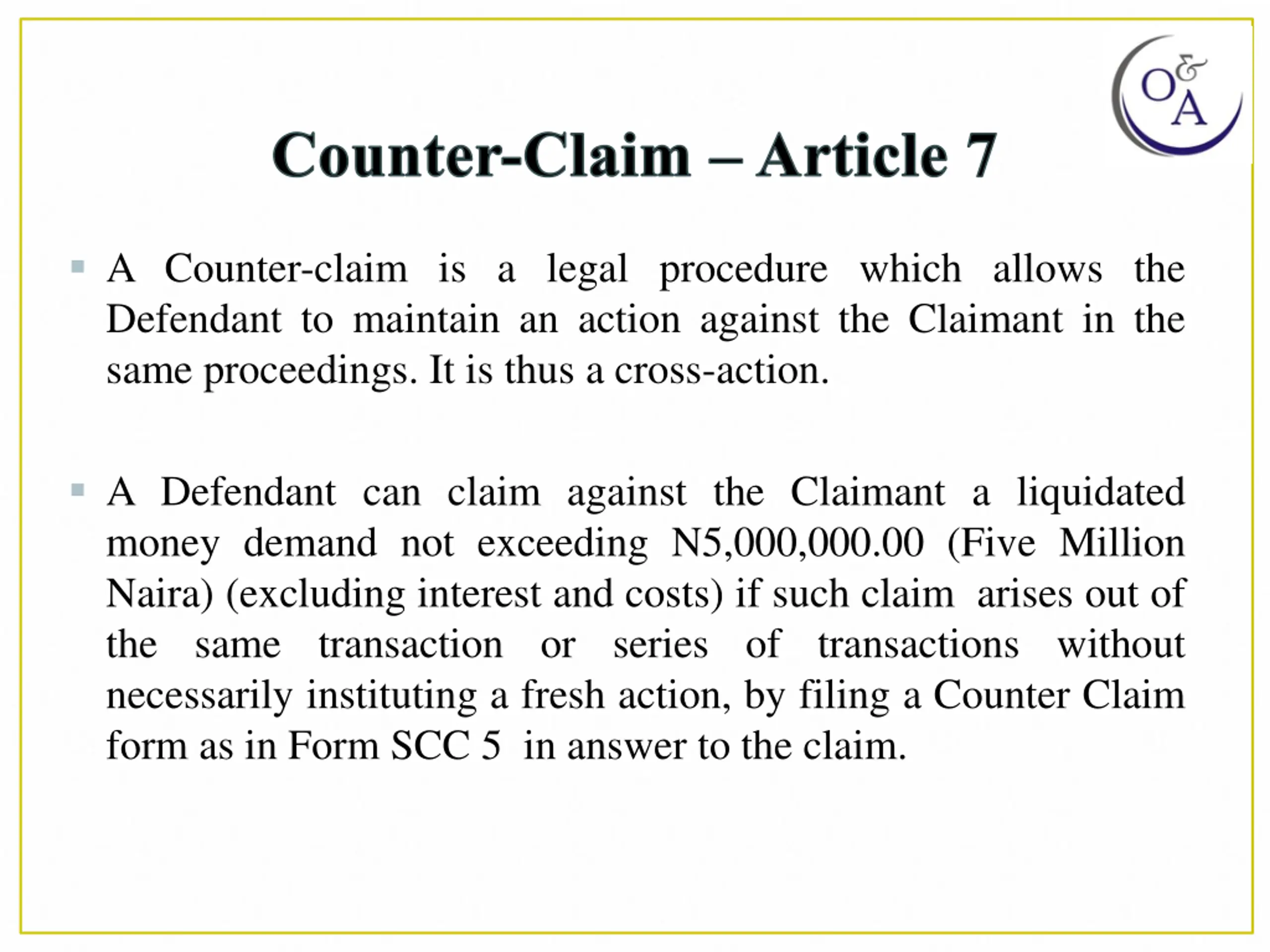 Counter-Claim Article 7 A Counter-claim is a legal procedure which allows the Defendant to maintain an action against the Claimant in the same proceedings. It is thus a cross-action. A Defendant can claim against the Claimant a liquidated money demand not exceeding N5,000,000.00 (Five Million Naira) (excluding interest and costs) if such claim arises out of the same transaction or series of transactions without necessarily instituting a fresh action, by filing a Counter Claim form as in Form SCC 5 in answer to the claim.
