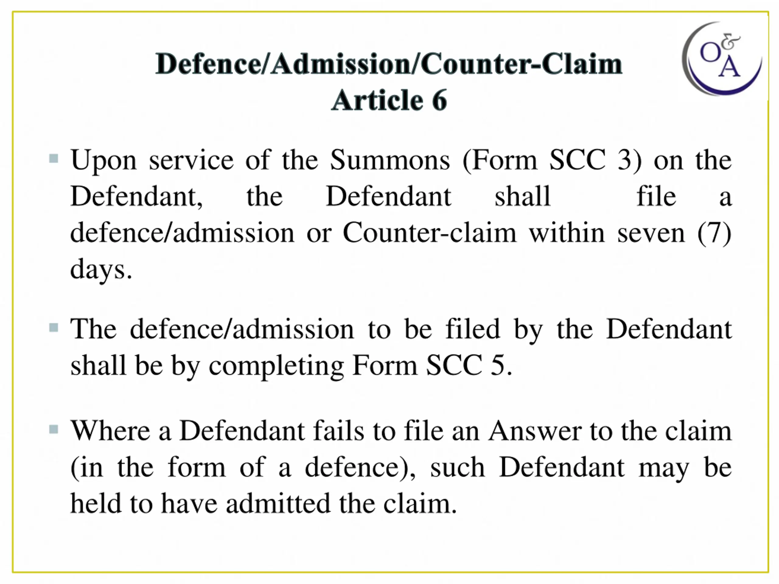 Defence/Admission/Counter-Claim Article 6 Upon service of the Summons (Form SCC 3) on the Defendant, the Defendant defence/admission or Counter-claim within seven (7) days. shall file a The defence/admission to be filed by the Defendant shall be by completing Form SCC 5. Where a Defendant fails to file an Answer to the claim (in the form of a defence), such Defendant may be held to have admitted the claim.