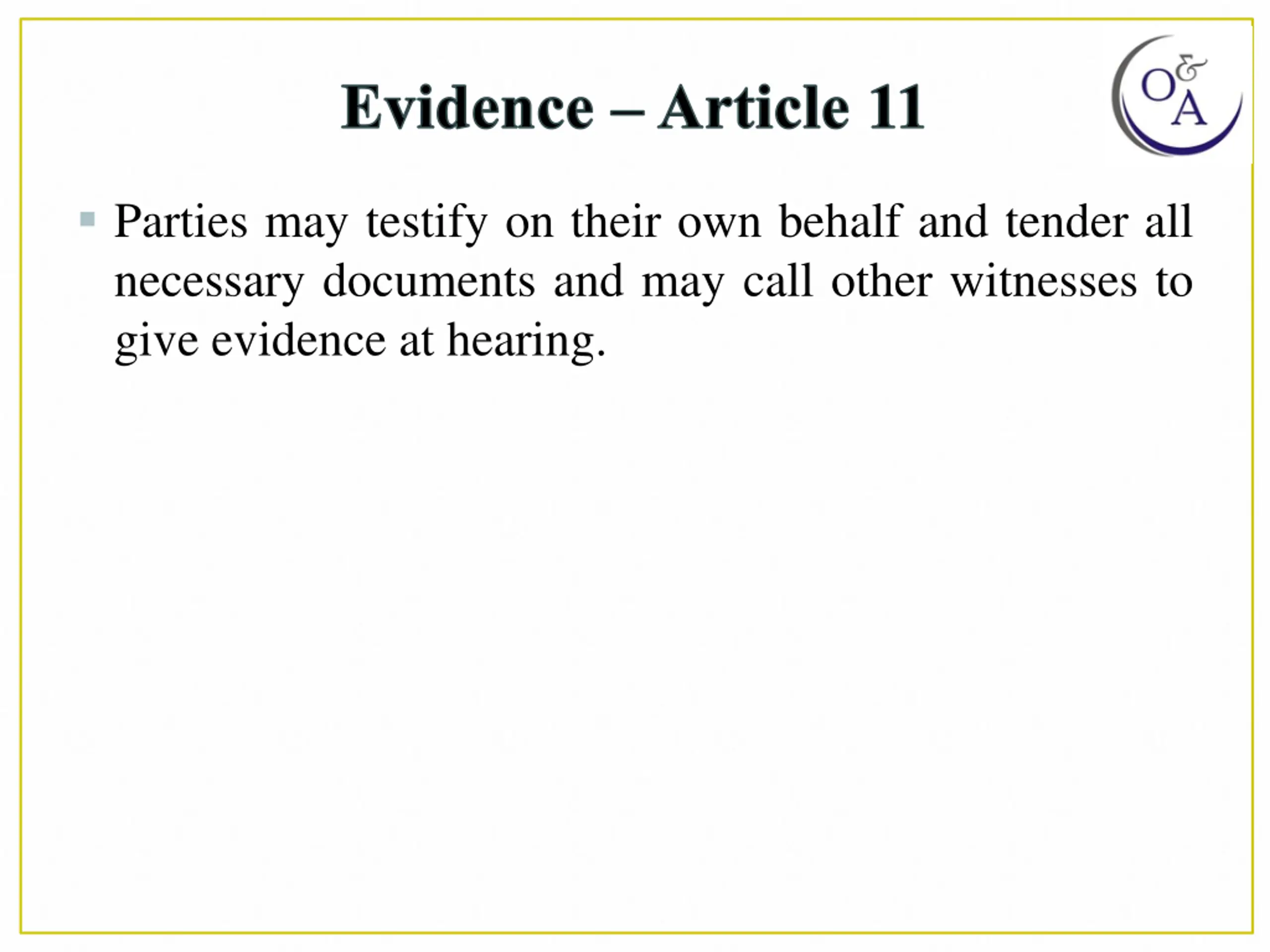 Evidence Article 11 Parties may testify on their own behalf and tender all necessary documents and may call other witnesses to give evidence at hearing.