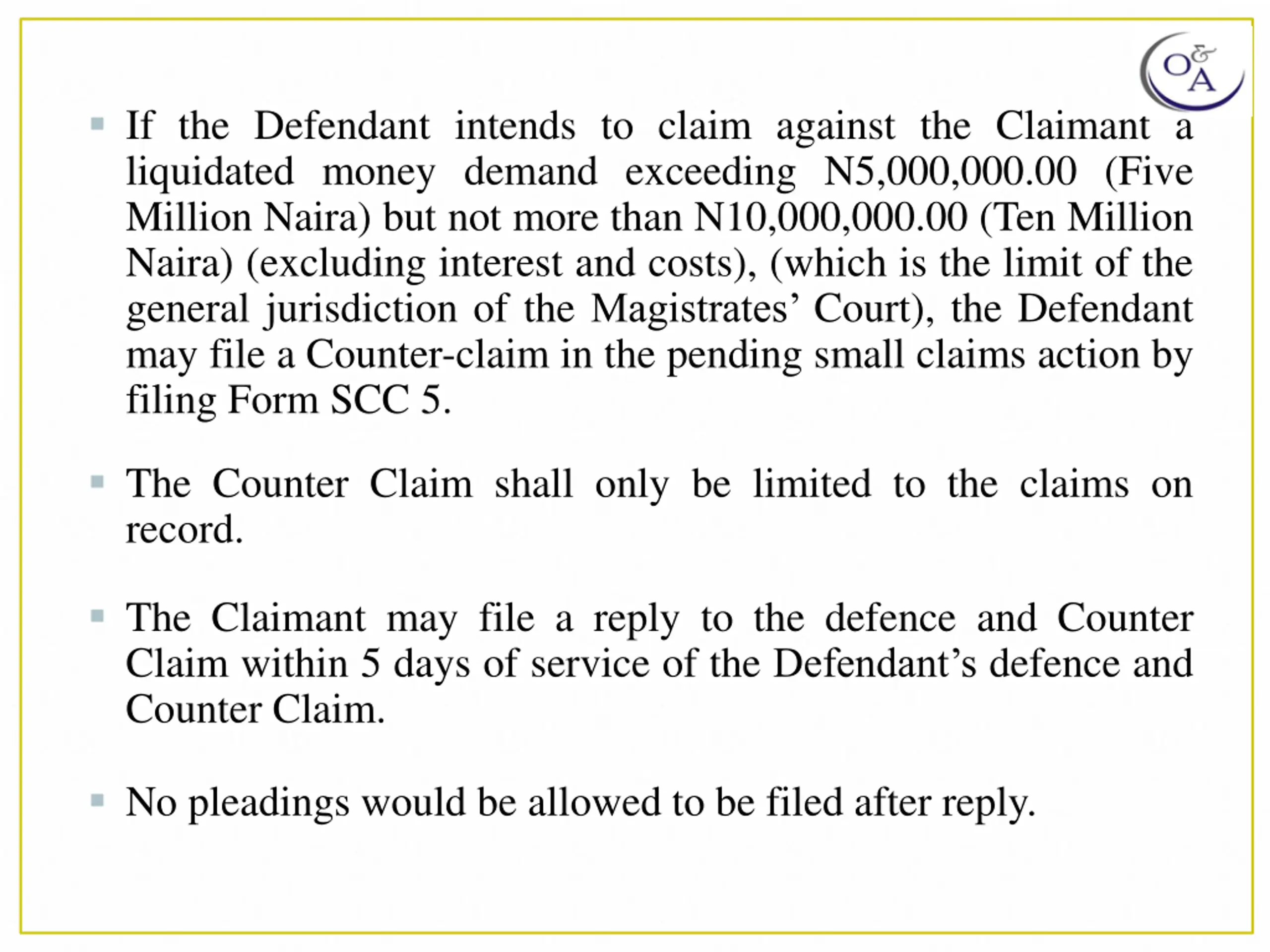 If the Defendant intends to claim against the Claimant a liquidated money demand exceeding N5,000,000.00 (Five Million Naira) but not more than N10,000,000.00 (Ten Million Naira) (excluding interest and costs), (which is the limit of the general jurisdiction of the Magistrates Court), the Defendant may file a Counter-claim in the pending small claims action by filing Form SCC 5. The Counter Claim shall only be limited to the claims on record. The Claimant may file a reply to the defence and Counter Claim within 5 days of service of the Defendant s defence and Counter Claim. No pleadings would be allowed to be filed after reply.