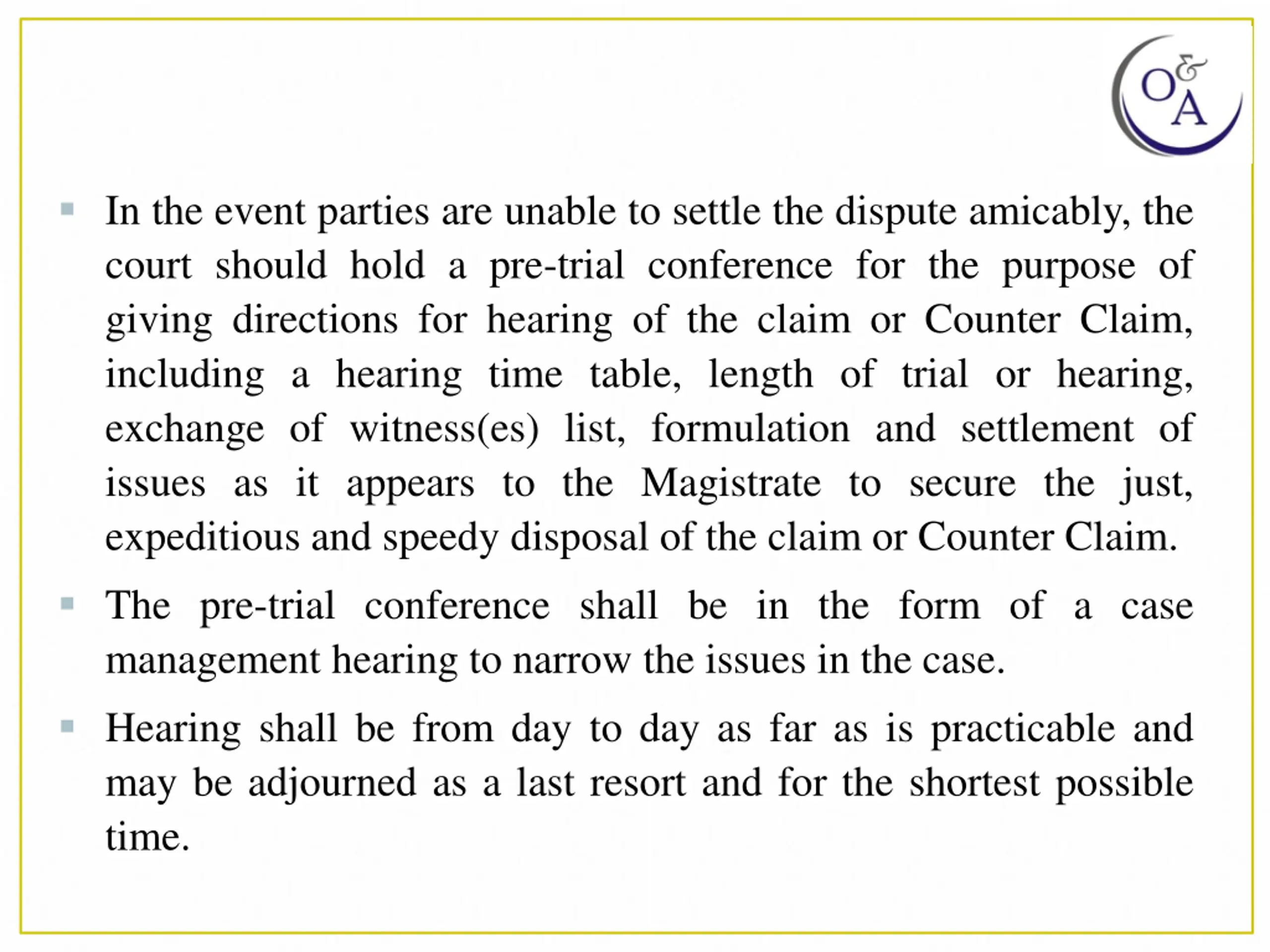 In the event parties are unable to settle the dispute amicably, the court should hold a pre-trial conference for the purpose of giving directions for hearing of the claim or Counter Claim, including a hearing time table, length of trial or hearing, exchange of witness(es) list, formulation and settlement of issues as it appears to the Magistrate to secure the just, expeditious and speedy disposal of the claim or Counter Claim. The pre-trial conference shall be in the form of a case management hearing to narrow the issues in the case. Hearing shall be from day to day as far as is practicable and may be adjourned as a last resort and for the shortest possible time.