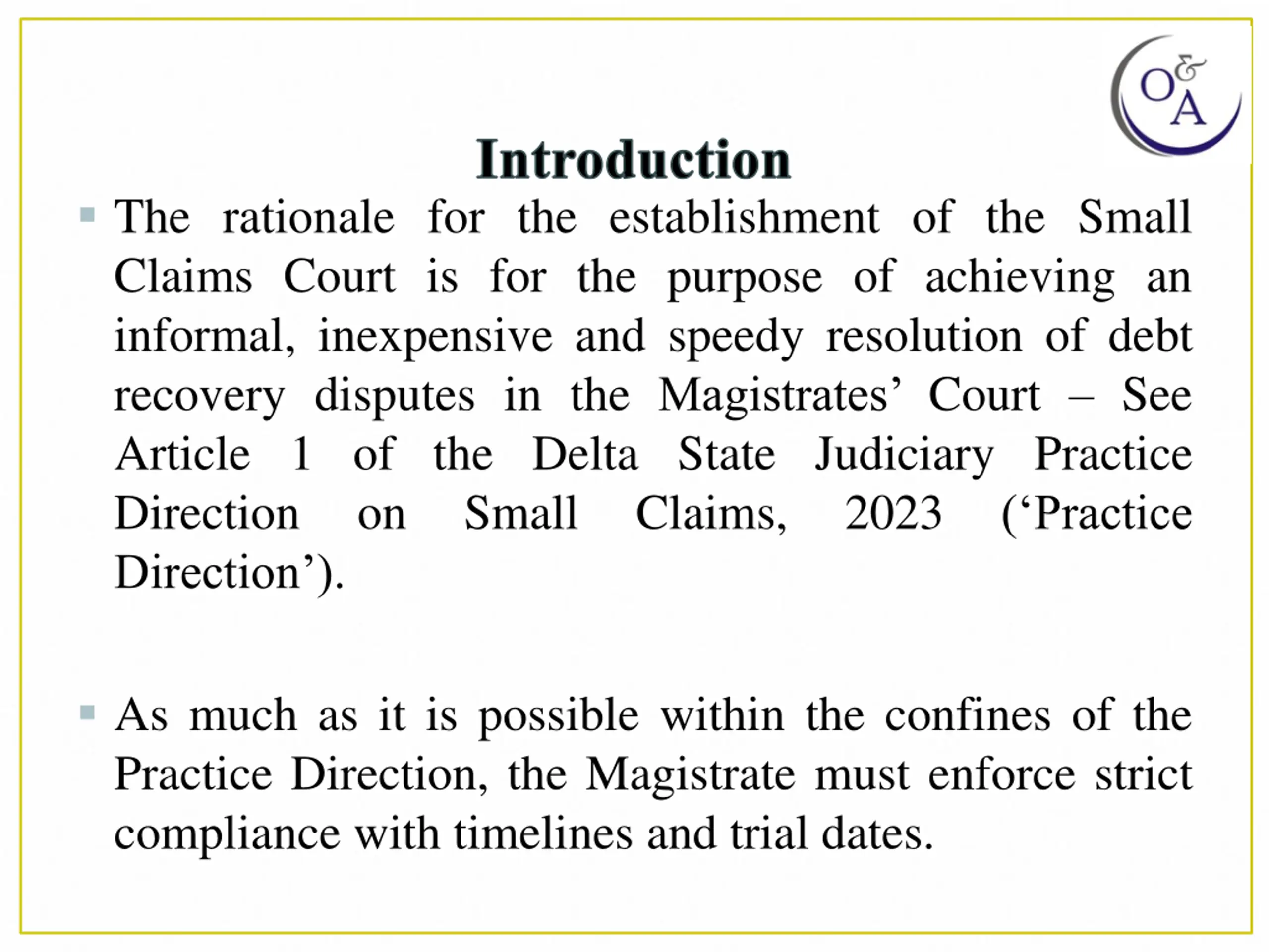 Introduction The rationale for the establishment of the Small Claims Court is for the purpose of achieving an informal, inexpensive and speedy resolution of debt recovery disputes in the Magistrates Court See Article 1 of the Delta State Judiciary Practice Direction on Small Direction ). Claims, 2023 ( Practice As much as it is possible within the confines of the Practice Direction, the Magistrate must enforce strict compliance with timelines and trial dates.