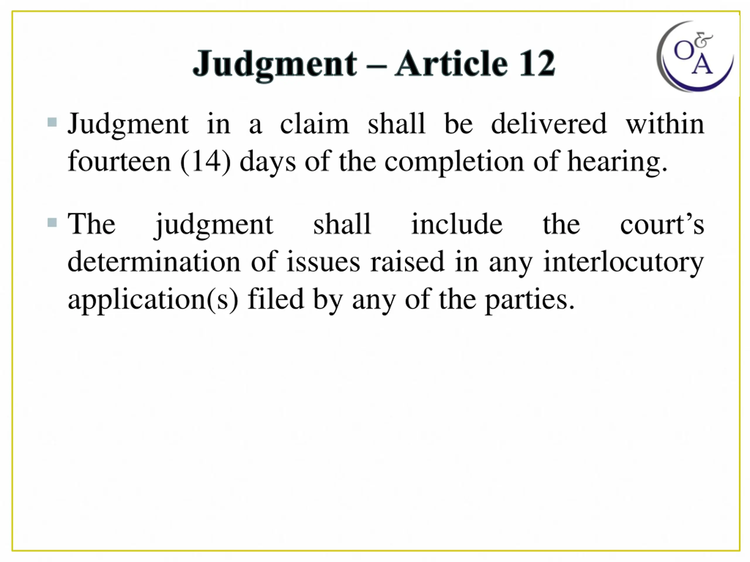 Judgment Article 12 Judgment in a claim shall be delivered within fourteen (14) days of the completion of hearing. The determination of issues raised in any interlocutory application(s) filed by any of the parties. judgment shall include the court s