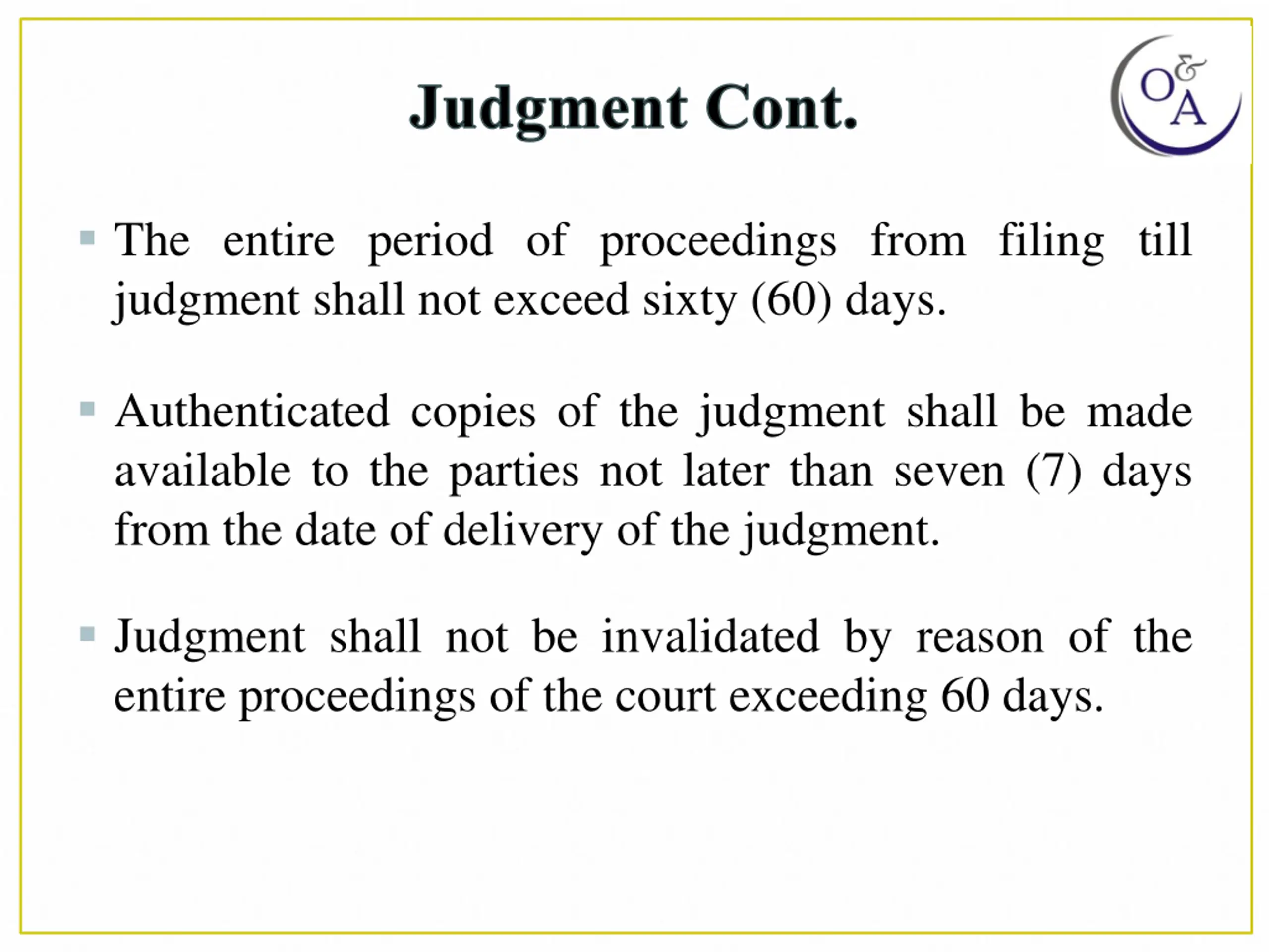 Judgment Cont. The entire period of proceedings from filing till judgment shall not exceed sixty (60) days. Authenticated copies of the judgment shall be made available to the parties not later than seven (7) days from the date of delivery of the judgment. Judgment shall not be invalidated by reason of the entire proceedings of the court exceeding 60 days.