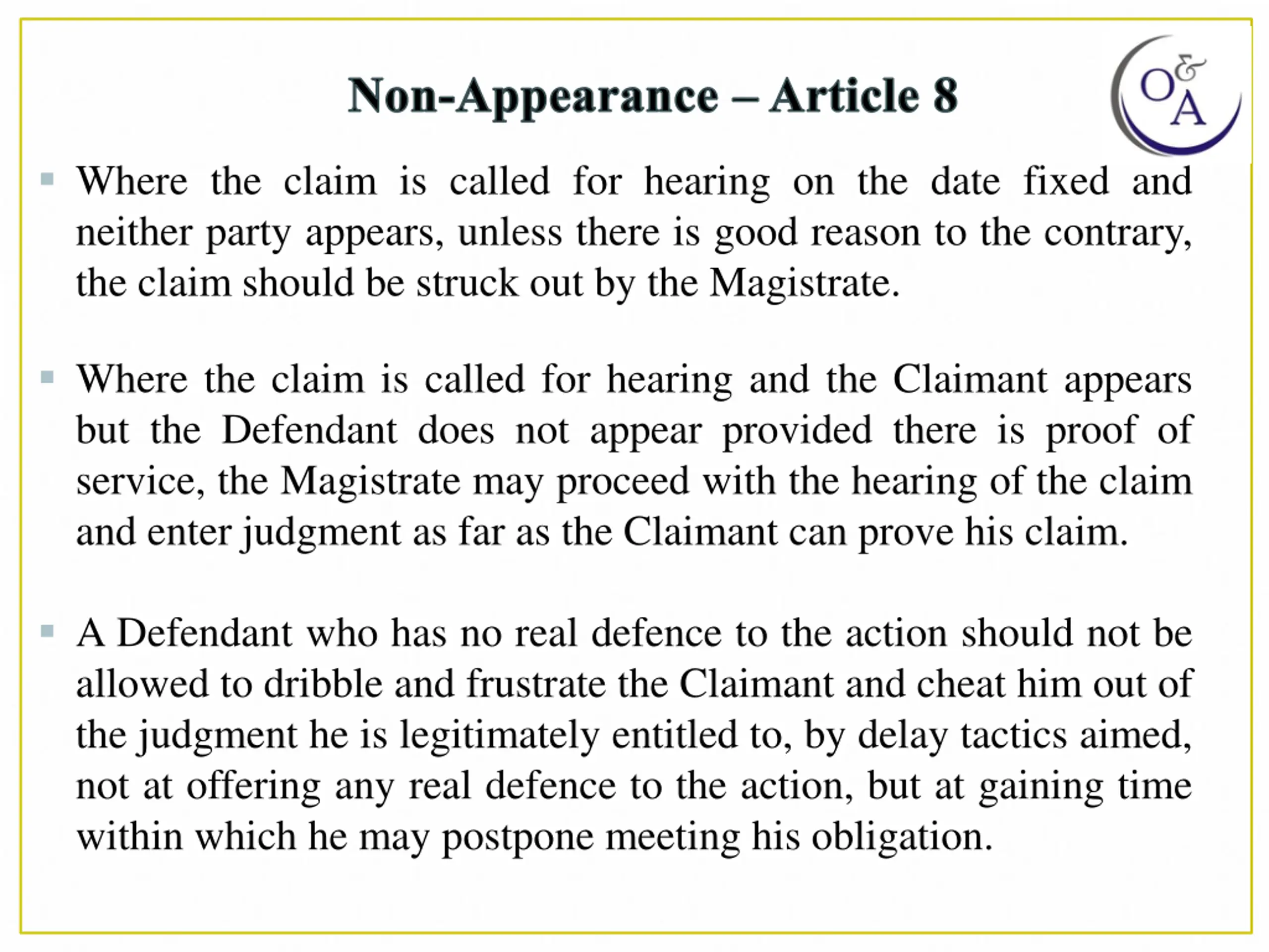 Non-Appearance Article 8 Where the claim is called for hearing on the date fixed and neither party appears, unless there is good reason to the contrary, the claim should be struck out by the Magistrate. Where the claim is called for hearing and the Claimant appears but the Defendant does not appear provided there is proof of service, the Magistrate may proceed with the hearing of the claim and enter judgment as far as the Claimant can prove his claim. A Defendant who has no real defence to the action should not be allowed to dribble and frustrate the Claimant and cheat him out of the judgment he is legitimately entitled to, by delay tactics aimed, not at offering any real defence to the action, but at gaining time within which he may postpone meeting his obligation.