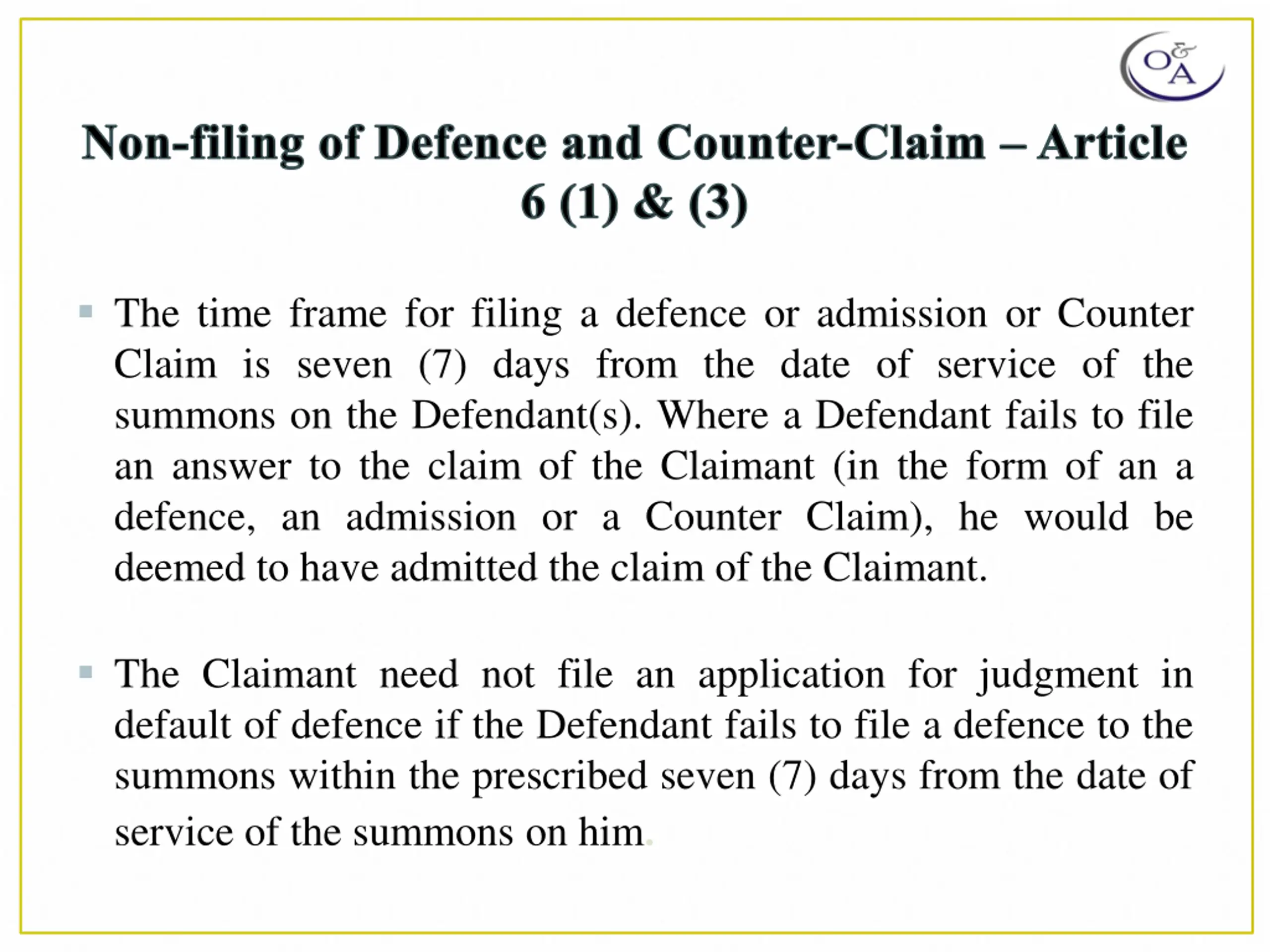 Non-filing of Defence and Counter-Claim Article 6 (1) & (3) The time frame for filing a defence or admission or Counter Claim is seven (7) days from the date of service of the summons on the Defendant(s). Where a Defendant fails to file an answer to the claim of the Claimant (in the form of an a defence, an admission or a Counter Claim), he would be deemed to have admitted the claim of the Claimant. The Claimant need not file an application for judgment in default of defence if the Defendant fails to file a defence to the summons within the prescribed seven (7) days from the date of service of the summons on him.
