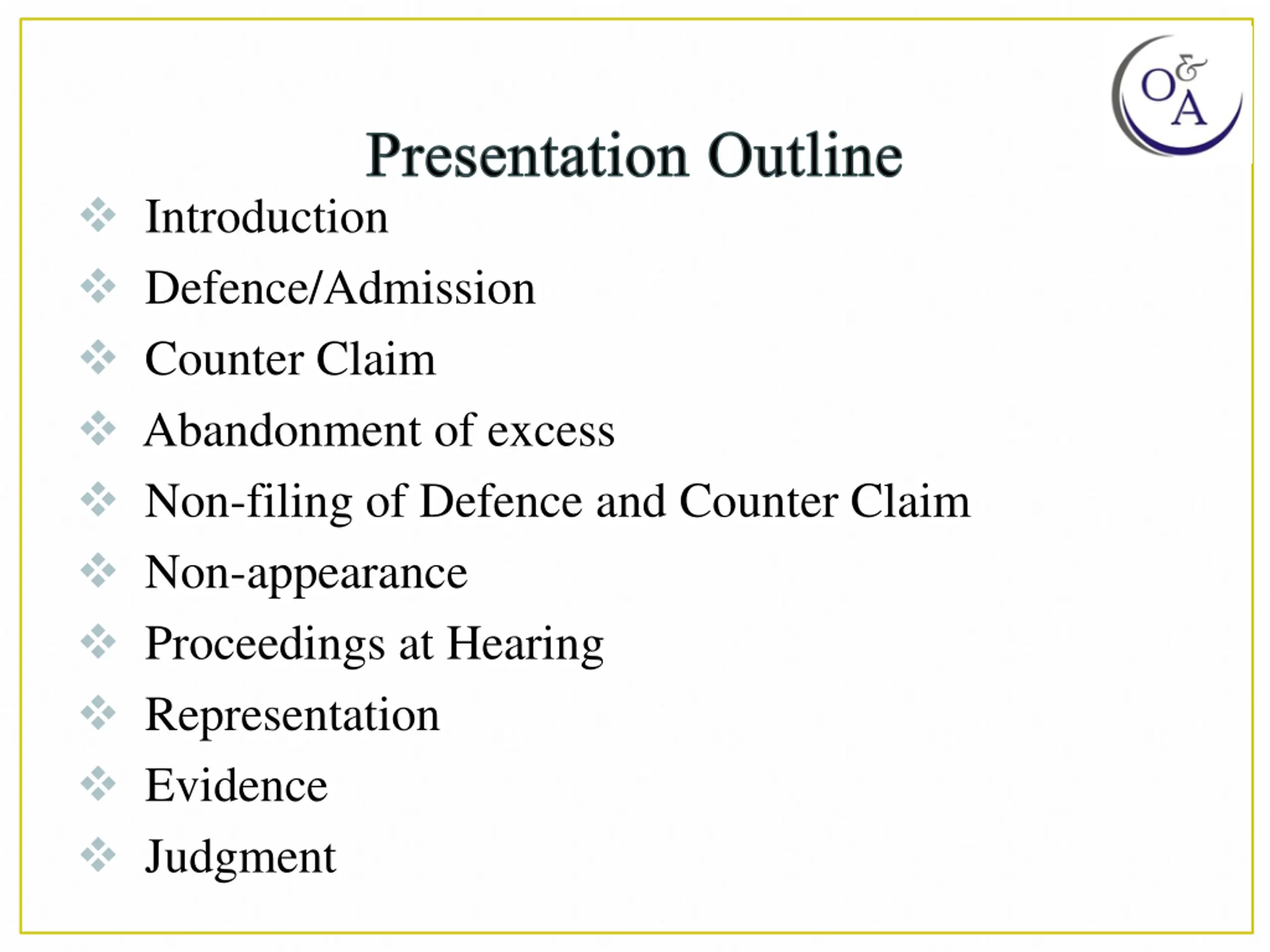 Presentation Outline Introduction Defence/Admission Counter Claim Abandonment of excess Non-filing of Defence and Counter Claim Non-appearance Proceedings at Hearing Representation Evidence Judgment