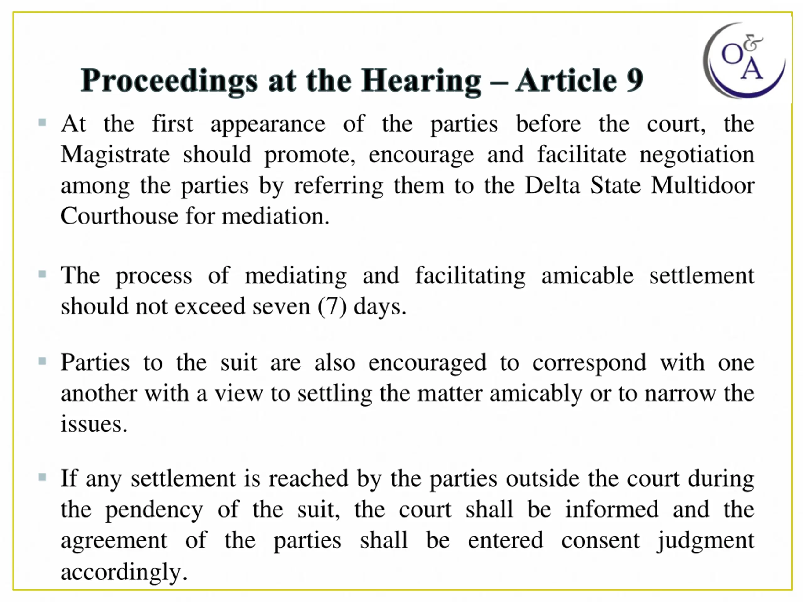 Proceedings at the Hearing Article 9 At the first appearance of the parties before the court, the Magistrate should promote, encourage and facilitate negotiation among the parties by referring them to the Delta State Multidoor Courthouse for mediation. The process of mediating and facilitating amicable settlement should not exceed seven (7) days. Parties to the suit are also encouraged to correspond with one another with a view to settling the matter amicably or to narrow the issues. If any settlement is reached by the parties outside the court during the pendency of the suit, the court shall be informed and the agreement of the parties shall be entered consent judgment accordingly.