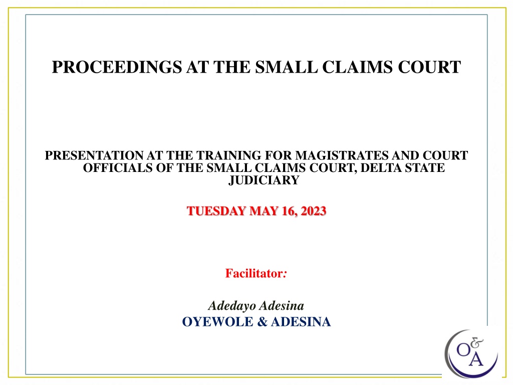 PROCEEDINGS AT THE SMALL CLAIMS COURT PRESENTATION AT THE TRAINING FOR MAGISTRATES AND COURT OFFICIALS OF THE SMALL CLAIMS COURT, DELTA STATE JUDICIARY TUESDAY MAY 16, 2023 Facilitator: Adedayo Adesina OYEWOLE & ADESINA