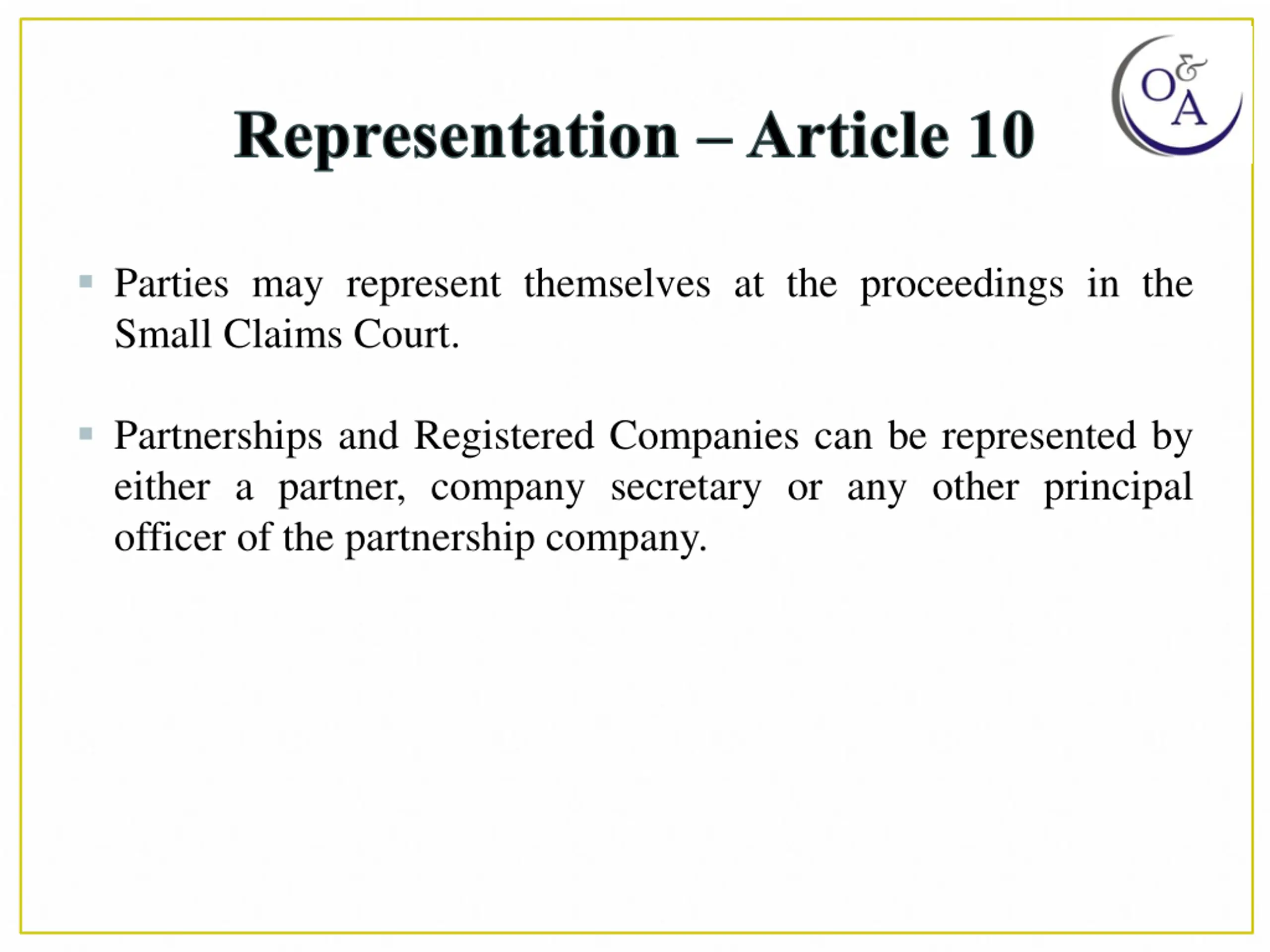 Representation Article 10 Parties may represent themselves at the proceedings in the Small Claims Court. Partnerships and Registered Companies can be represented by either a partner, company secretary or any other principal officer of the partnership company.