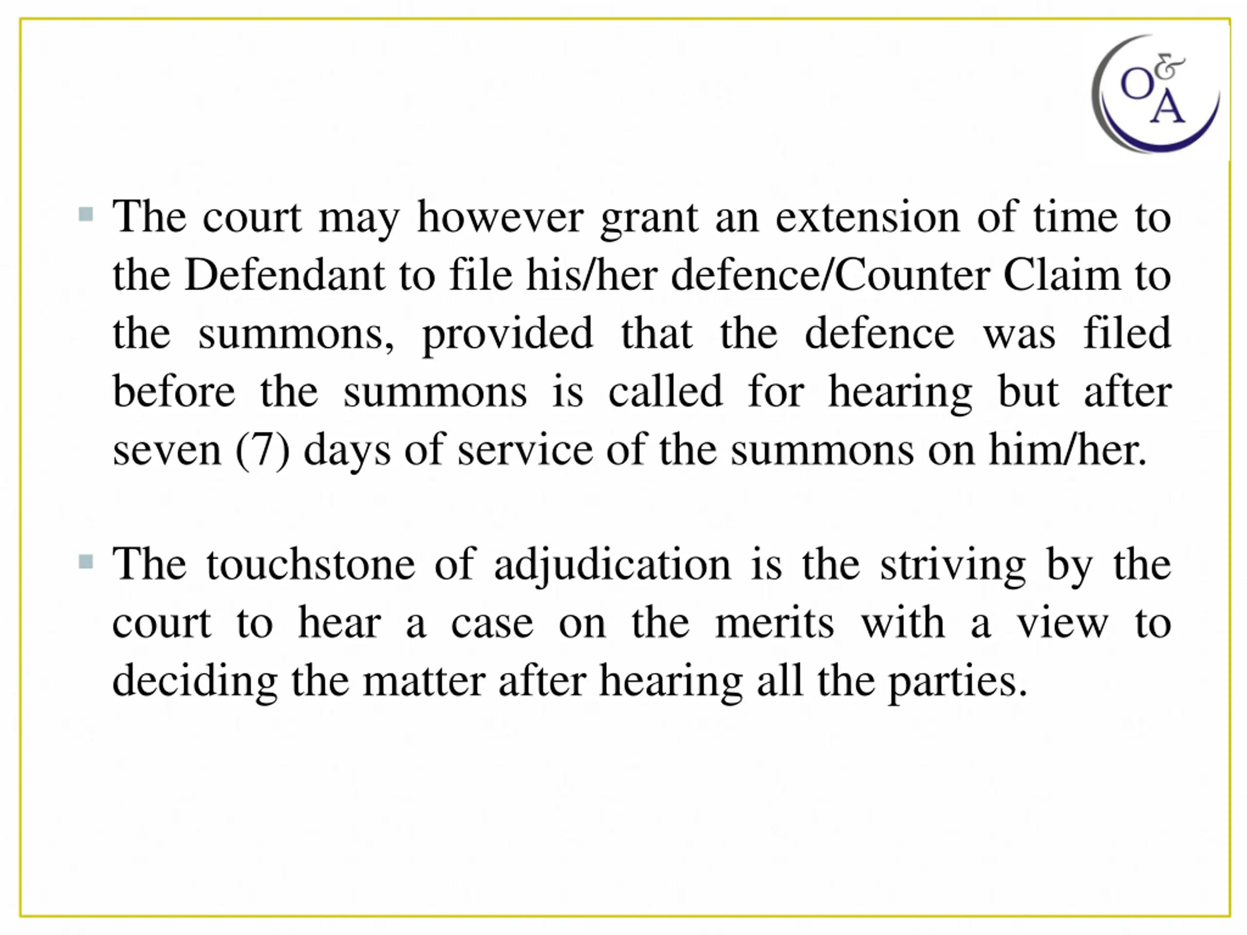 The court may however grant an extension of time to the Defendant to file his/her defence/Counter Claim to the summons, provided that the defence was filed before the summons is called for hearing but after seven (7) days of service of the summons on him/her. The touchstone of adjudication is the striving by the court to hear a case on the merits with a view to deciding the matter after hearing all the parties.