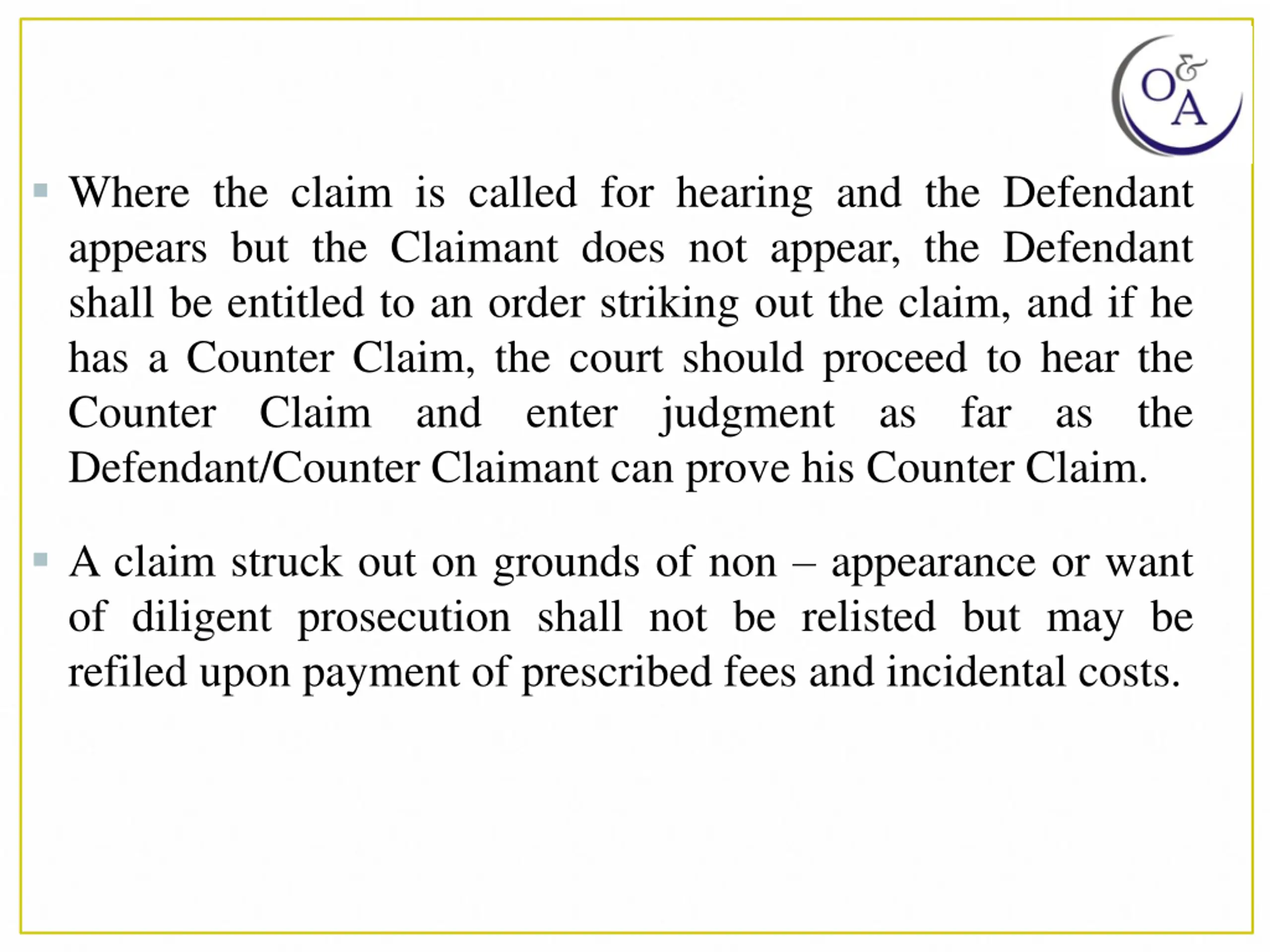 Where the claim is called for hearing and the Defendant appears but the Claimant does not appear, the Defendant shall be entitled to an order striking out the claim, and if he has a Counter Claim, the court should proceed to hear the Counter Claim and enter Defendant/Counter Claimant can prove his Counter Claim. judgment as far as the A claim struck out on grounds of non appearance or want of diligent prosecution shall not be relisted but may be refiled upon payment of prescribed fees and incidental costs.