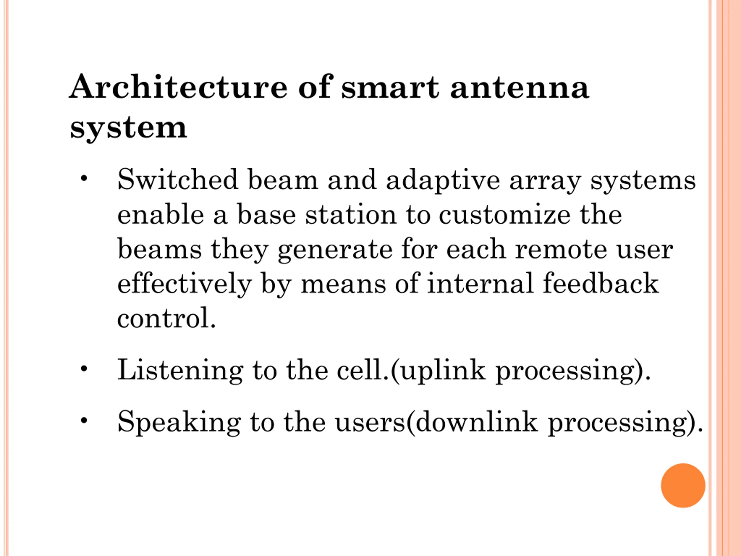 Architecture of smart antenna system Switched beam and adaptive array systems enable a base station to customize the beams they generate for each remote user effectively by means of internal feedback control. Listening to the cell.(uplink processing). Speaking to the users(downlink processing).