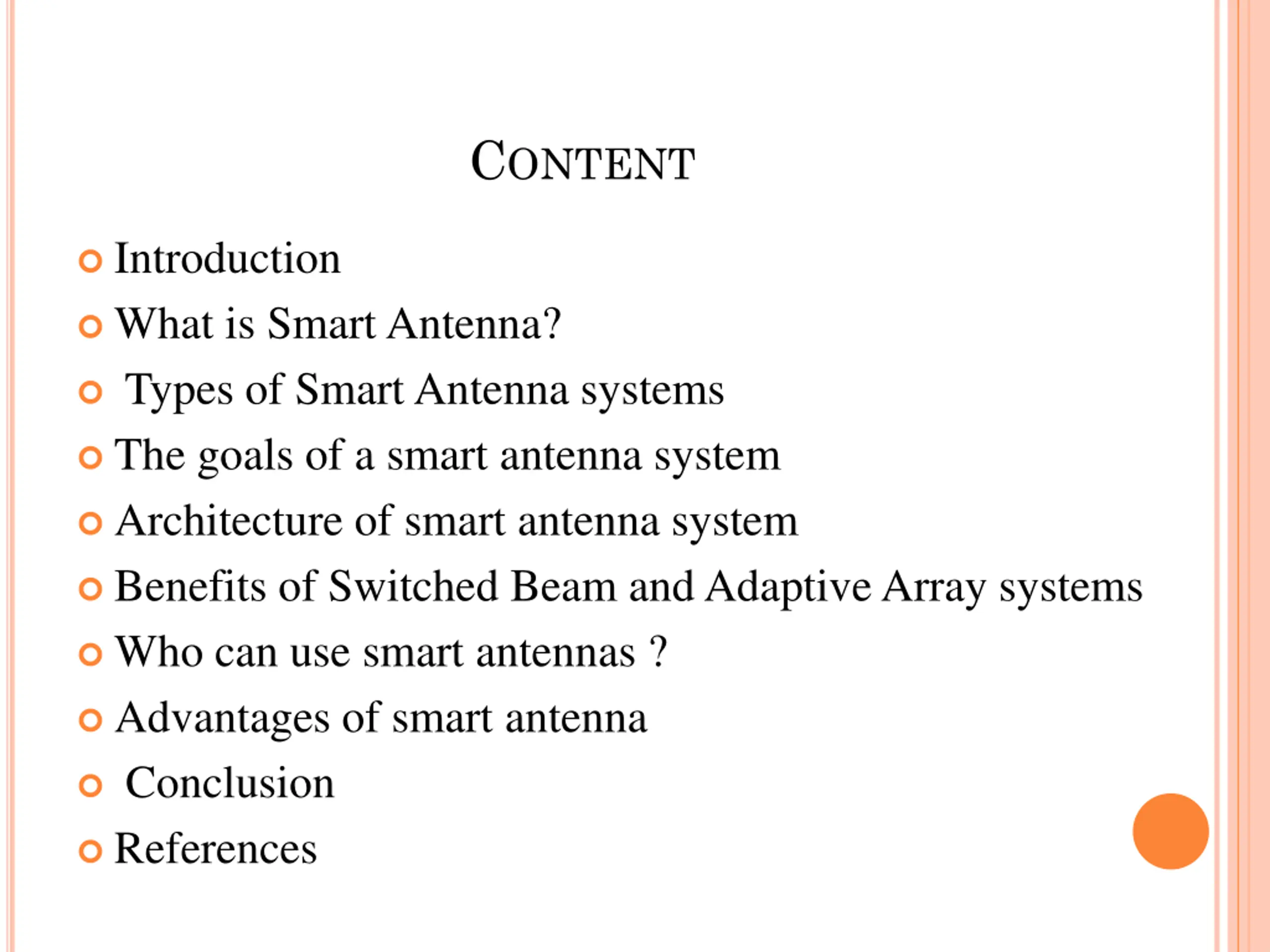 CONTENT Introduction What is Smart Antenna? Types of Smart Antenna systems The goals of a smart antenna system Architecture of smart antenna system Benefits of Switched Beam and Adaptive Array systems Who can use smart antennas ? Advantages of smart antenna Conclusion References
