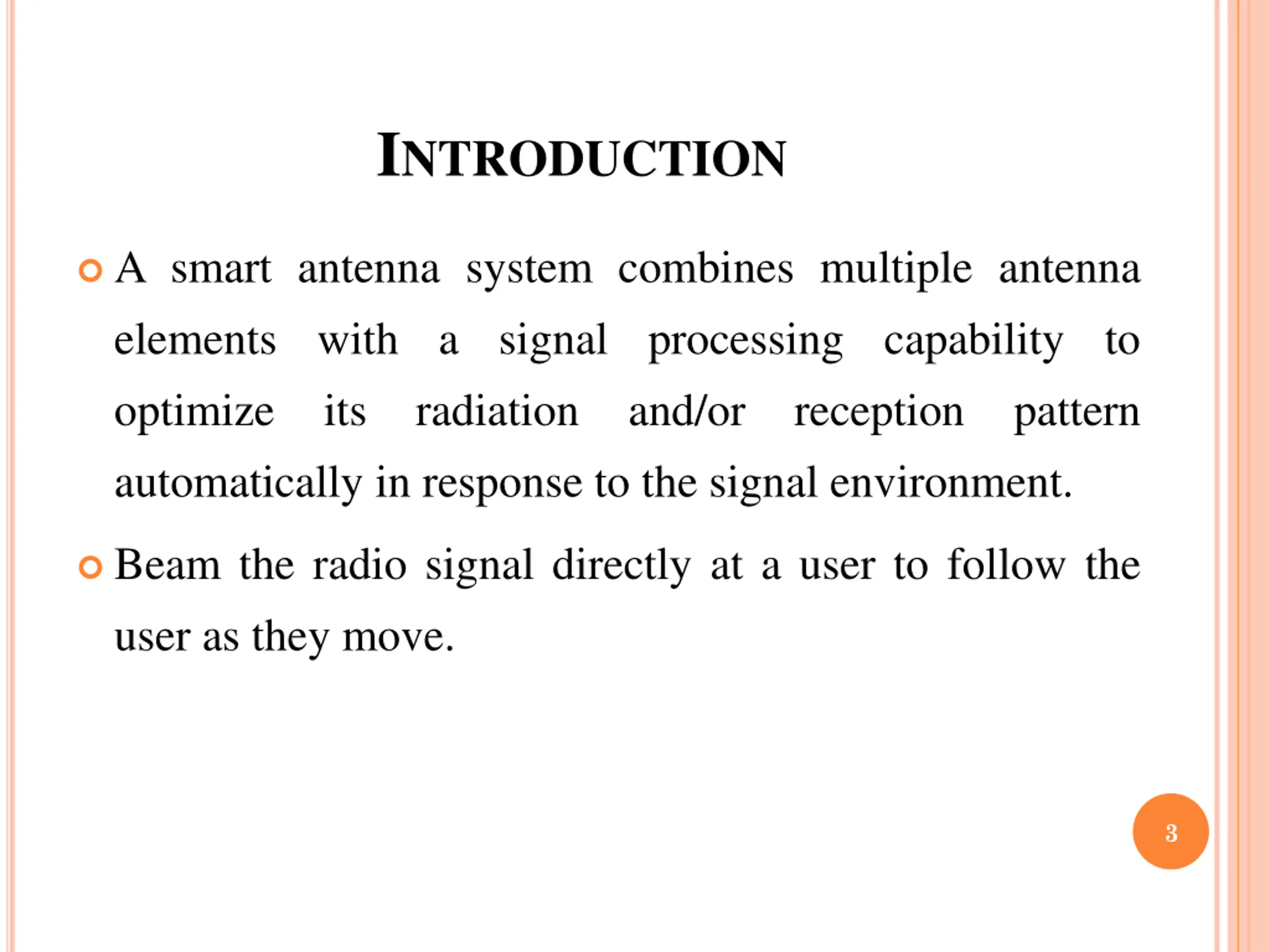 INTRODUCTION A smart antenna system combines multiple antenna elements with a signal processing capability to optimize its radiation and/or reception pattern automatically in response to the signal environment. Beam the radio signal directly at a user to follow the user as they move. 3
