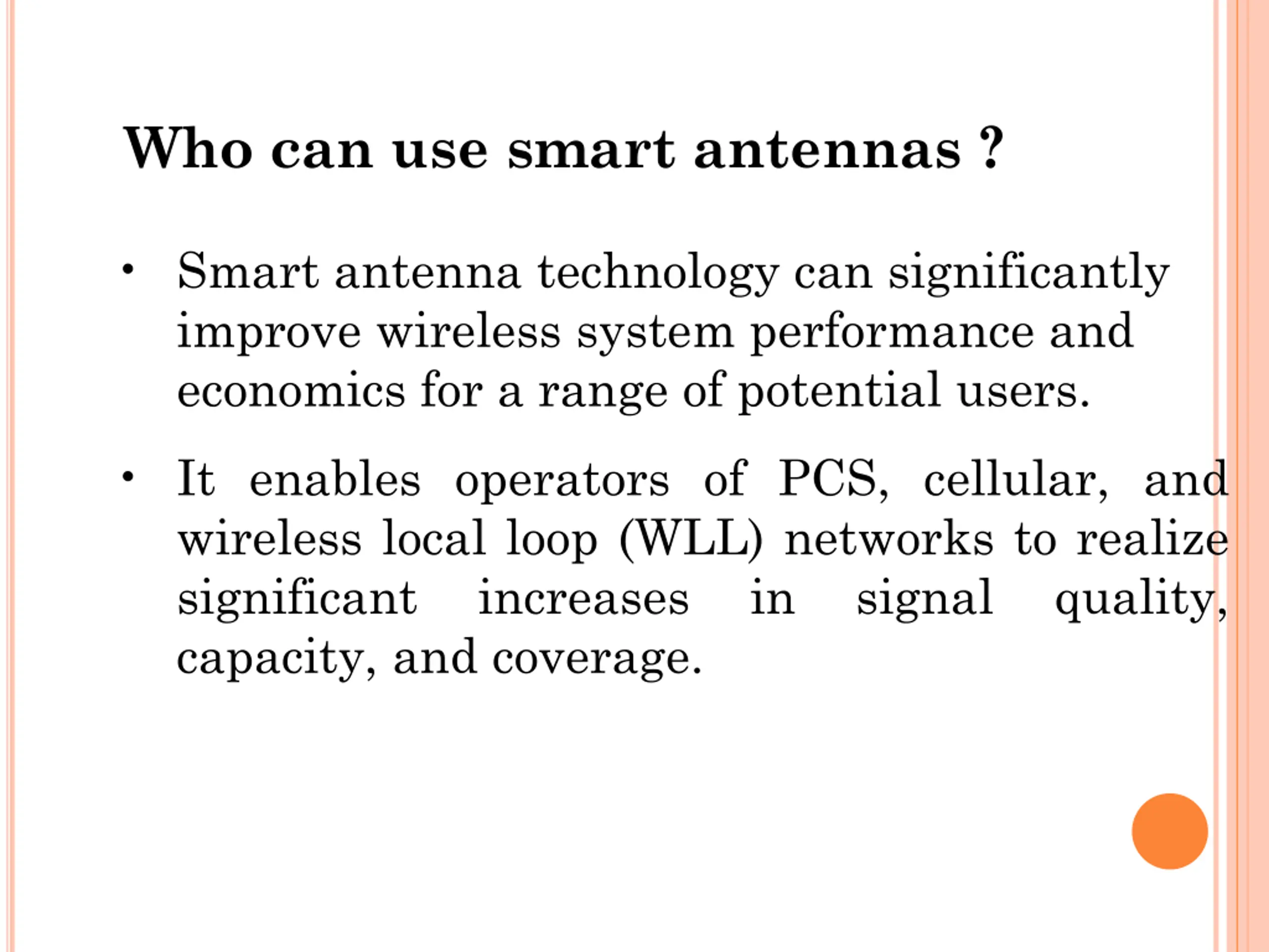 Who can use smart antennas ? Smart antenna technology can significantly improve wireless system performance and economics for a range of potential users. It enables operators of PCS, cellular, and wireless local loop (WLL) networks to realize significant increases capacity, and coverage. in signal quality,