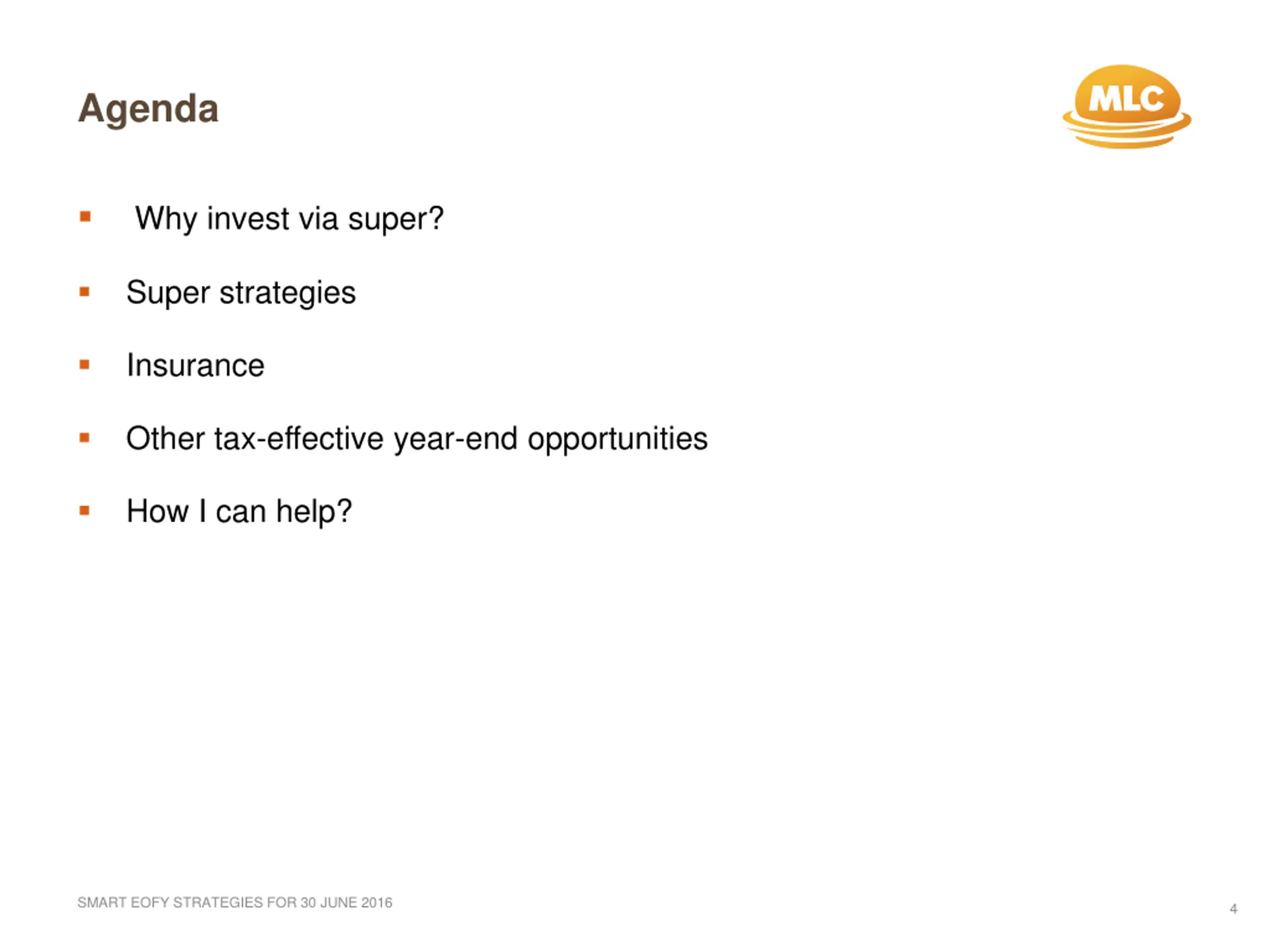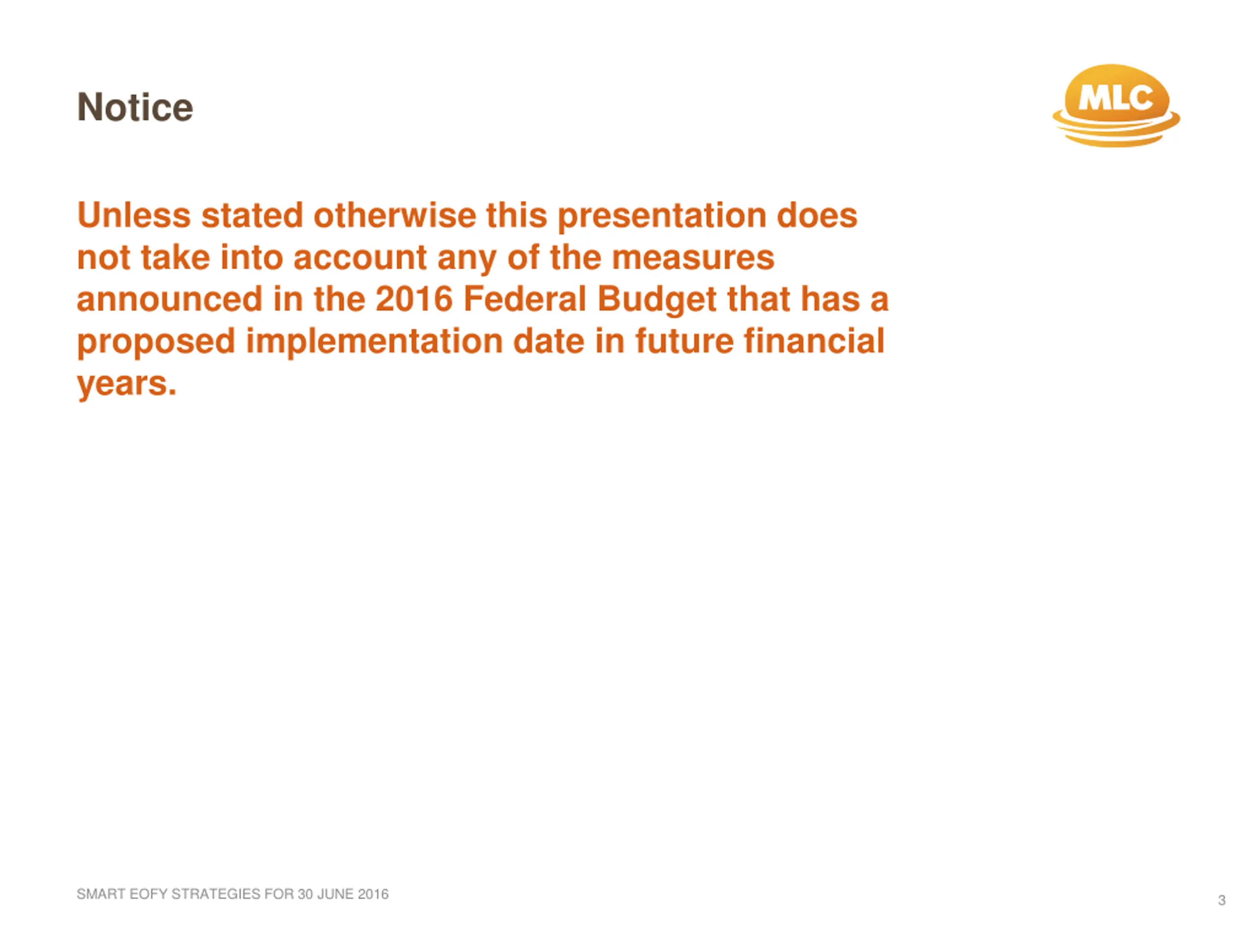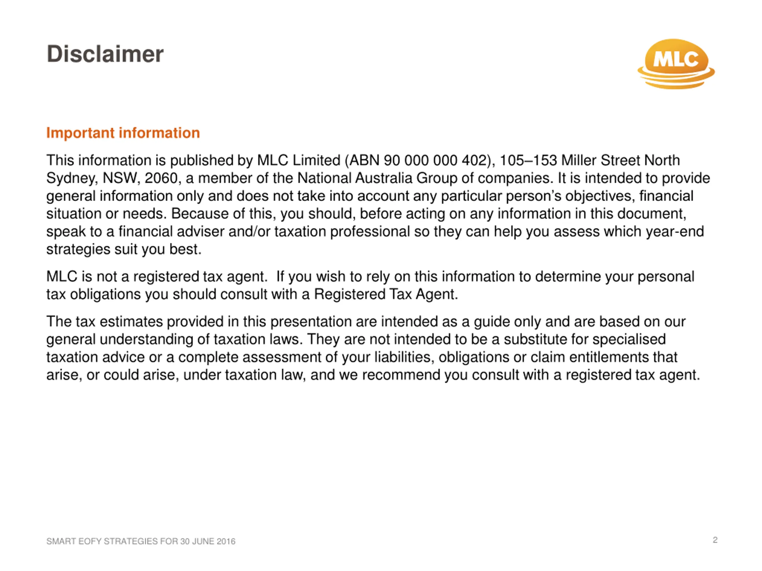 Disclaimer Important information This information is published by MLC Limited (ABN 90 000 000 402), 105 153 Miller Street North Sydney, NSW, 2060, a member of the National Australia Group of companies. It is intended to provide general information only and does not take into account any particular person s objectives, financial situation or needs. Because of this, you should, before acting on any information in this document, speak to a financial adviser and/or taxation professional so they can help you assess which year-end strategies suit you best. MLC is not a registered tax agent. If you wish to rely on this information to determine your personal tax obligations you should consult with a Registered Tax Agent. The tax estimates provided in this presentation are intended as a guide only and are based on our general understanding of taxation laws. They are not intended to be a substitute for specialised taxation advice or a complete assessment of your liabilities, obligations or claim entitlements that arise, or could arise, under taxation law, and we recommend you consult with a registered tax agent. 2 SMART EOFY STRATEGIES FOR 30 JUNE 2016