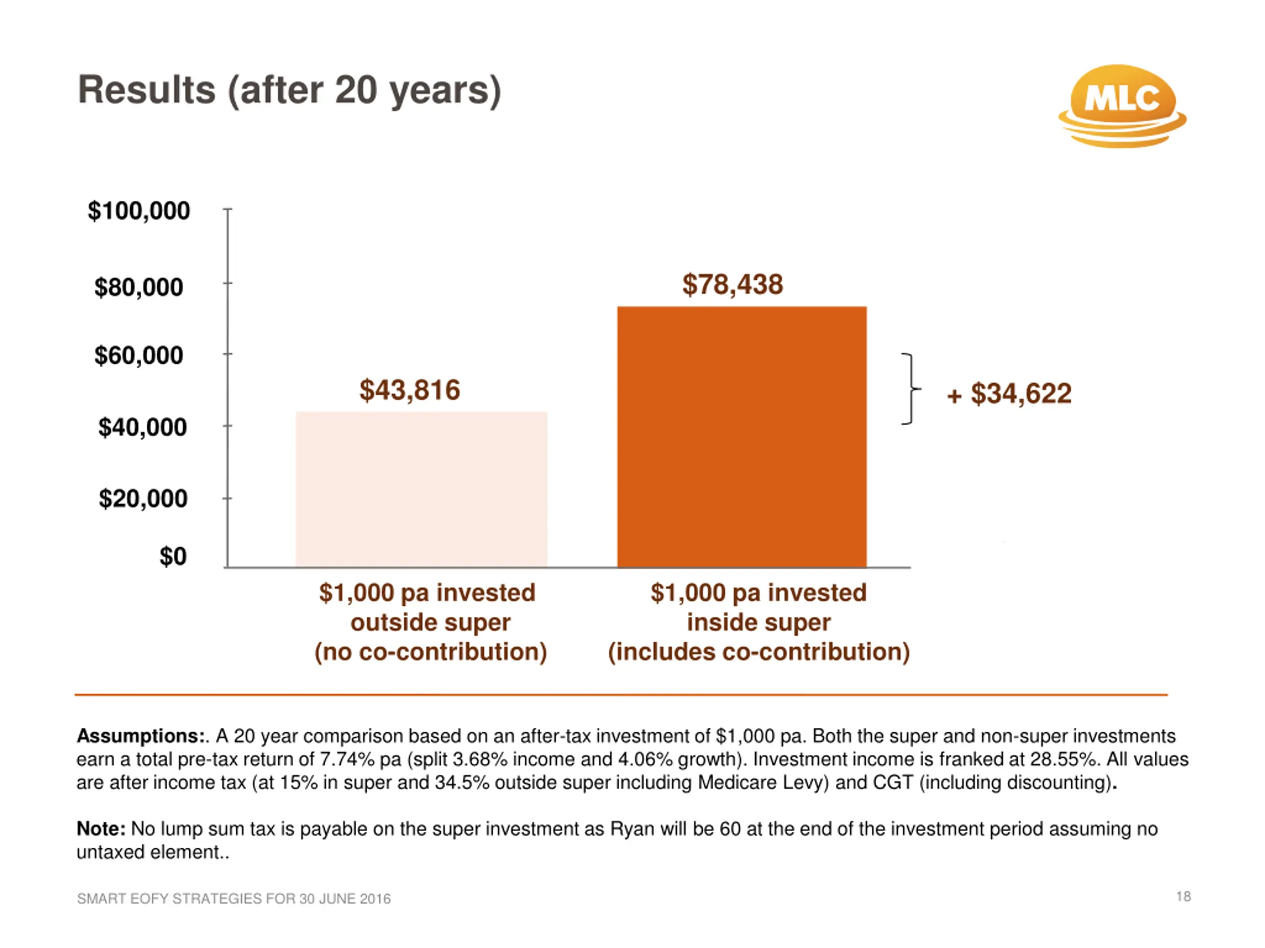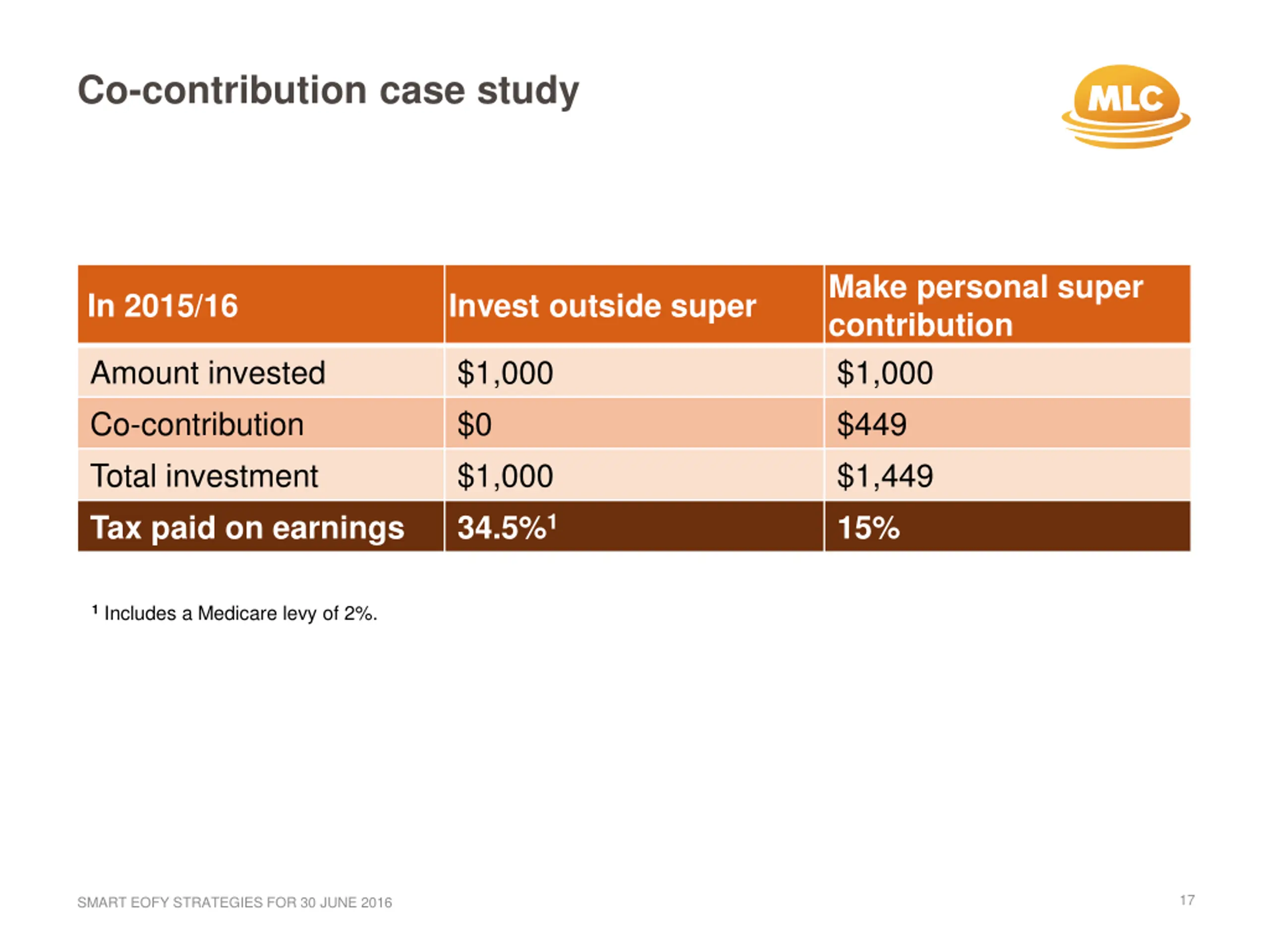 Co-contribution case study Make personal super contribution $1,000 $449 $1,449 15% In 2015/16 Invest outside super Amount invested Co-contribution Total investment Tax paid on earnings $1,000 $0 $1,000 34.5%1 1Includes a Medicare levy of 2%. 17 SMART EOFY STRATEGIES FOR 30 JUNE 2016
