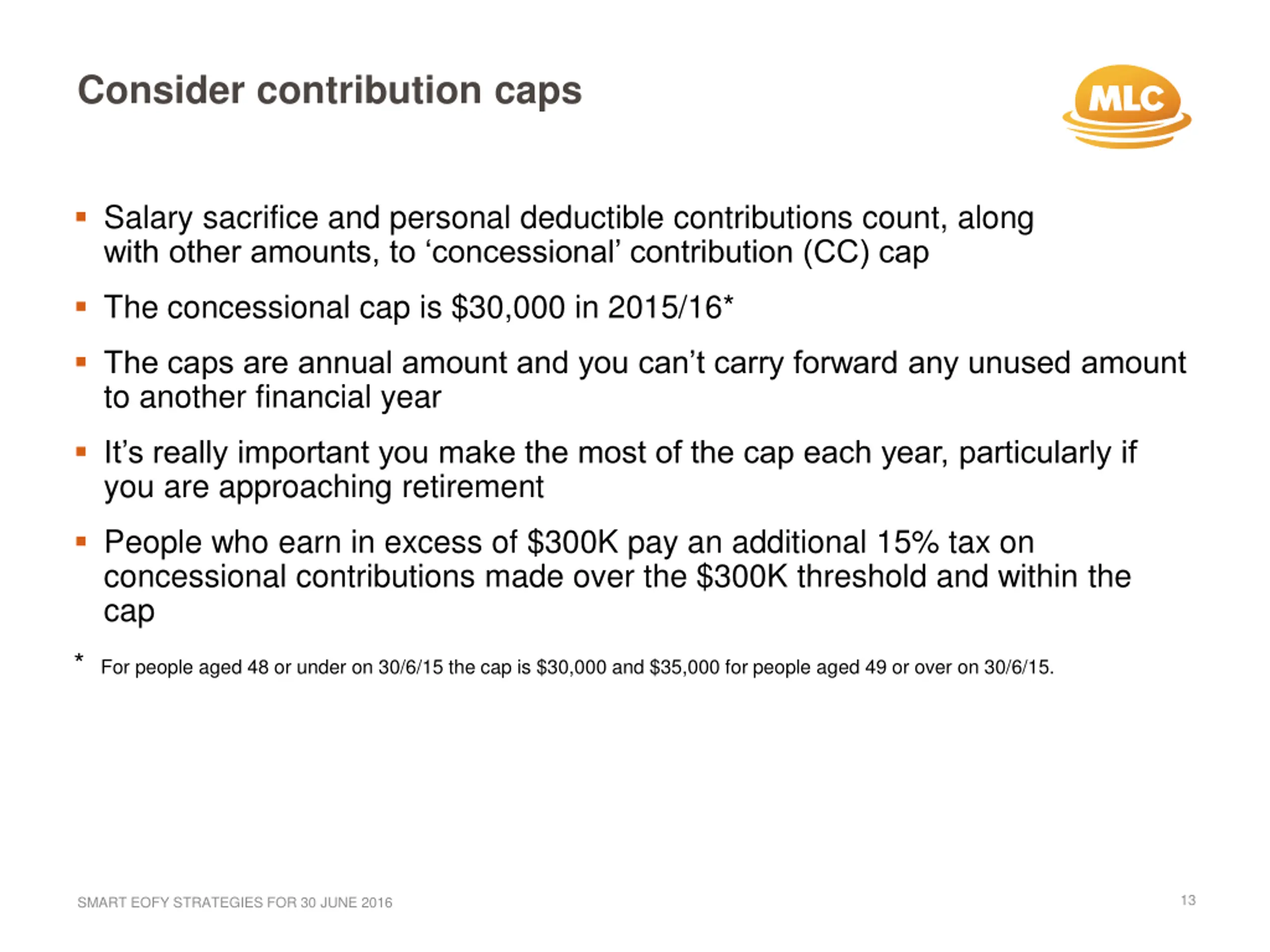Consider contribution caps Salary sacrifice and personal deductible contributions count, along with other amounts, to concessional contribution (CC) cap The concessional cap is $30,000 in 2015/16* The caps are annual amount and you can t carry forward any unused amount to another financial year It s really important you make the most of the cap each year, particularly if you are approaching retirement People who earn in excess of $300K pay an additional 15% tax on concessional contributions made over the $300K threshold and within the cap * For people aged 48 or under on 30/6/15 the cap is $30,000 and $35,000 for people aged 49 or over on 30/6/15. 13 SMART EOFY STRATEGIES FOR 30 JUNE 2016