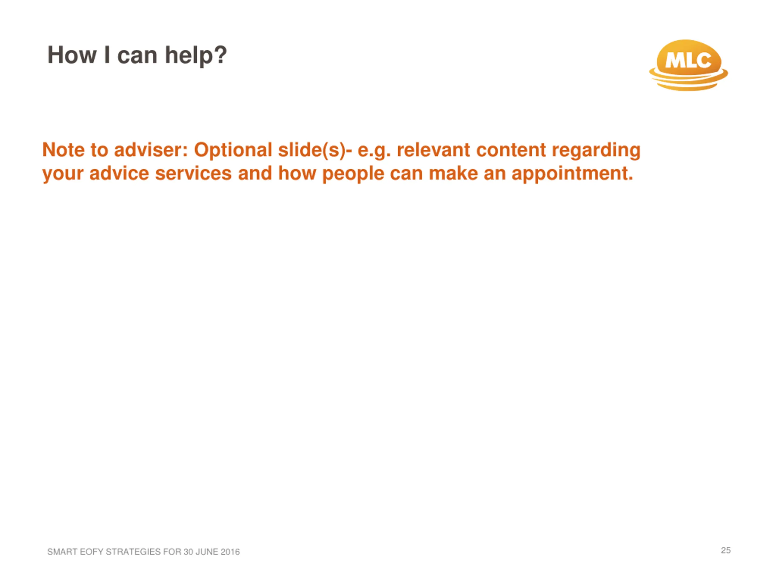 How I can help? Note to adviser: Optional slide(s)- e.g. relevant content regarding your advice services and how people can make an appointment. 25 SMART EOFY STRATEGIES FOR 30 JUNE 2016
