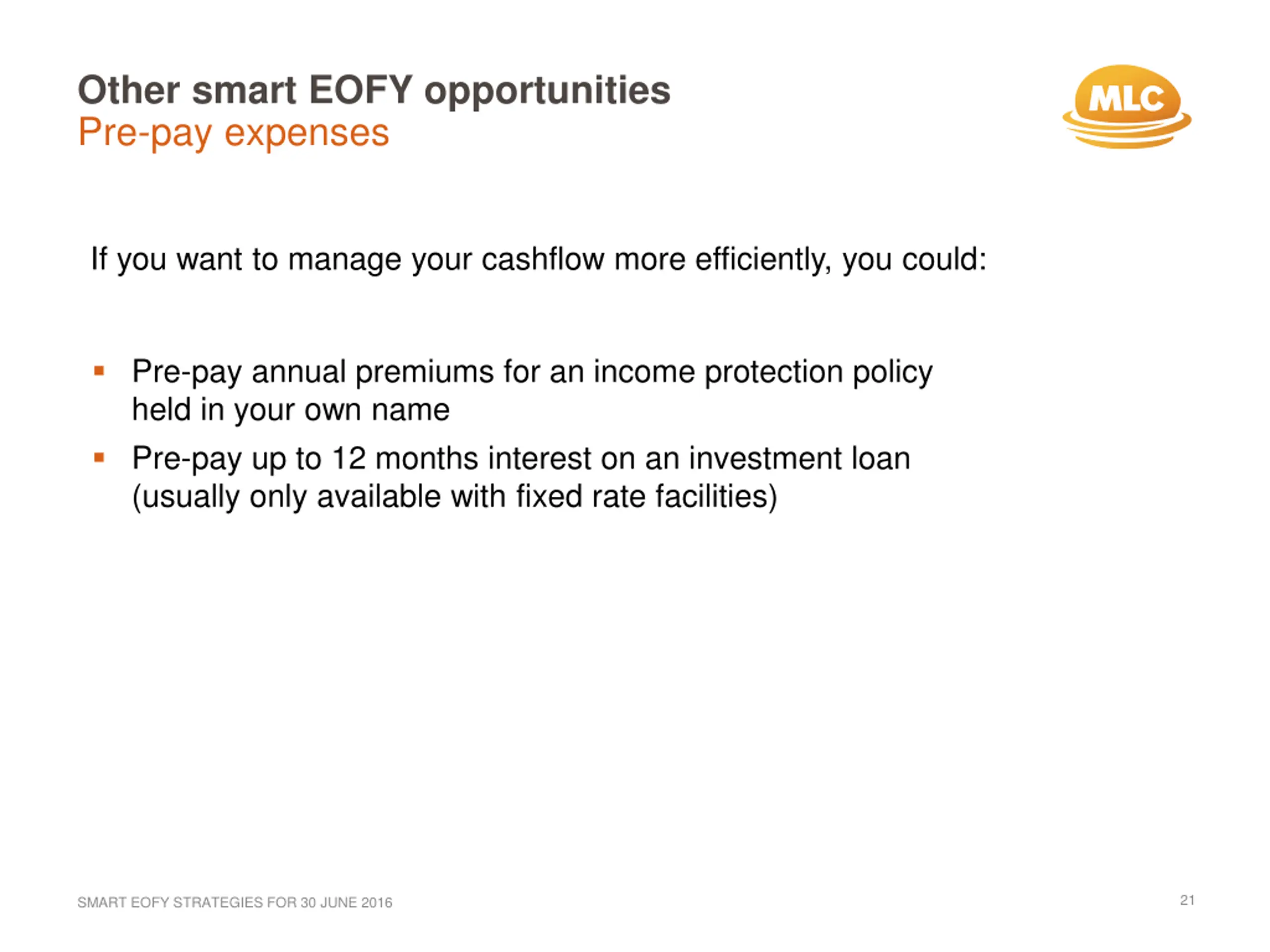 Other smart EOFY opportunities Pre-pay expenses If you want to manage your cashflow more efficiently, you could: Pre-pay annual premiums for an income protection policy held in your own name Pre-pay up to 12 months interest on an investment loan (usually only available with fixed rate facilities) 21 SMART EOFY STRATEGIES FOR 30 JUNE 2016