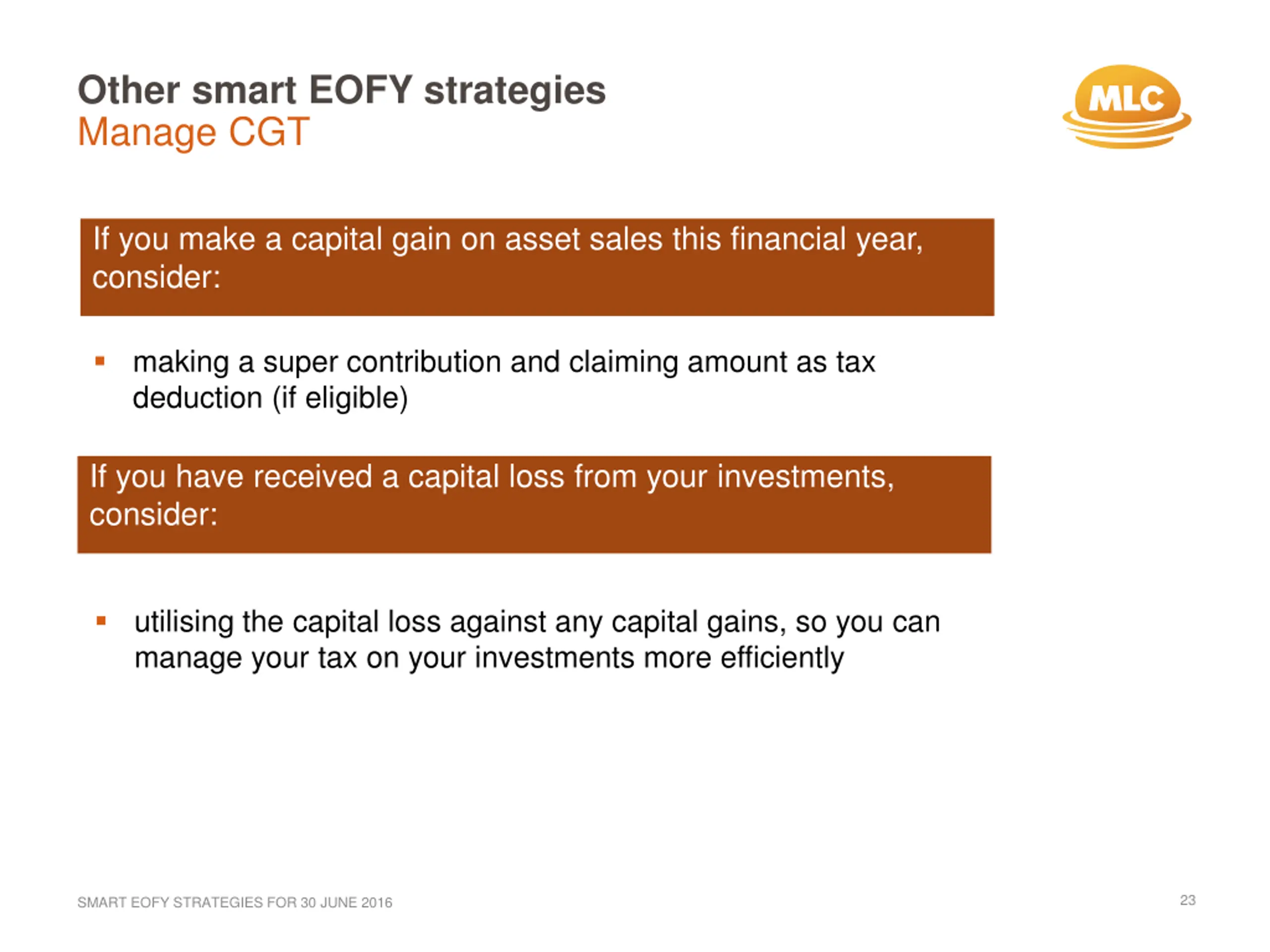 Other smart EOFY strategies Manage CGT If you make a capital gain on asset sales this financial year, consider: making a super contribution and claiming amount as tax deduction (if eligible) If you have received a capital loss from your investments, consider: utilising the capital loss against any capital gains, so you can manage your tax on your investments more efficiently 23 SMART EOFY STRATEGIES FOR 30 JUNE 2016