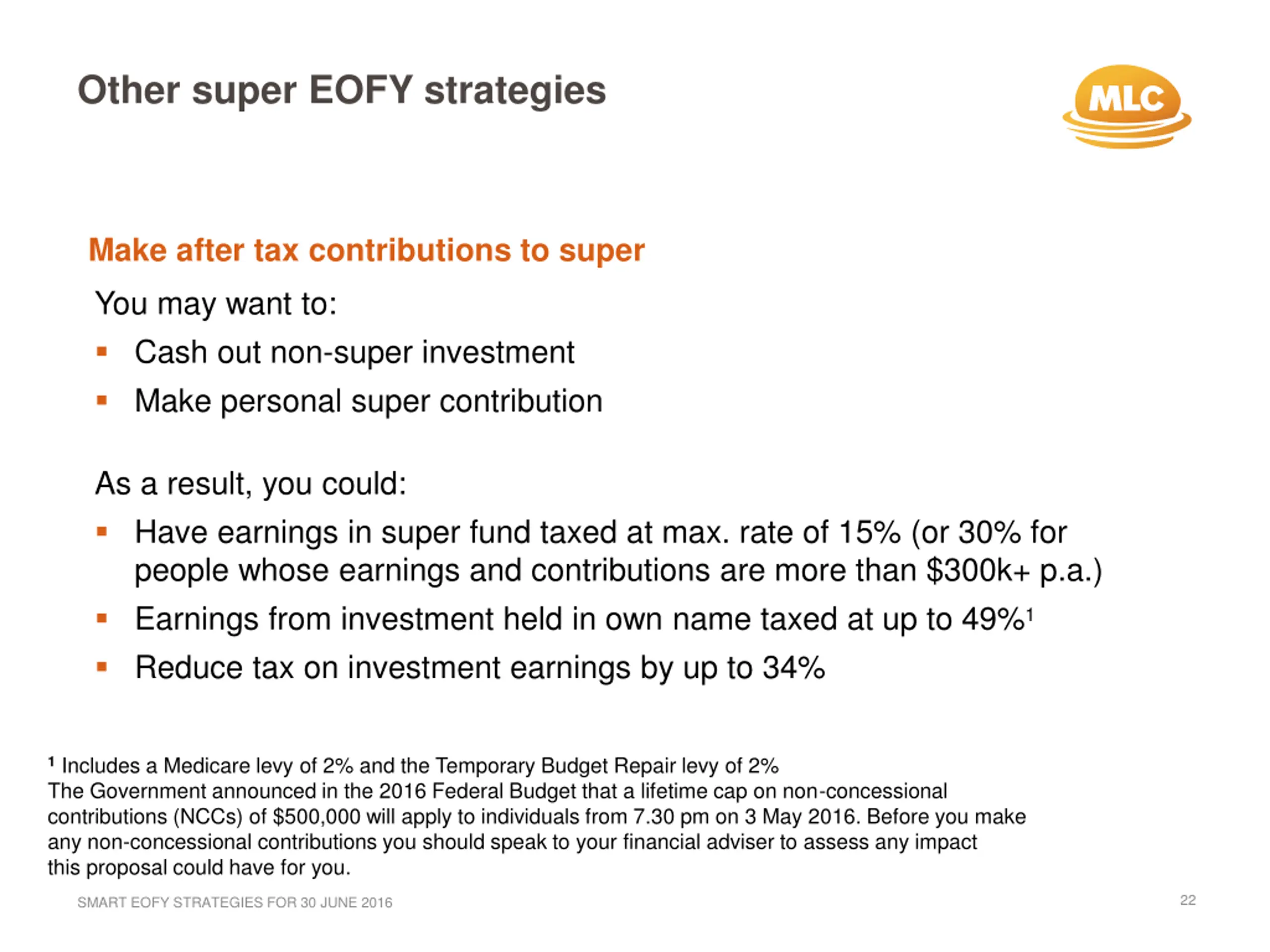 Other super EOFY strategies Make after tax contributions to super You may want to: Cash out non-super investment Make personal super contribution As a result, you could: Have earnings in super fund taxed at max. rate of 15% (or 30% for people whose earnings and contributions are more than $300k+ p.a.) Earnings from investment held in own name taxed at up to 49%1 Reduce tax on investment earnings by up to 34% 1Includes a Medicare levy of 2% and the Temporary Budget Repair levy of 2% The Government announced in the 2016 Federal Budget that a lifetime cap on non-concessional contributions (NCCs) of $500,000 will apply to individuals from 7.30 pm on 3 May 2016. Before you make any non-concessional contributions you should speak to your financial adviser to assess any impact this proposal could have for you. 22 SMART EOFY STRATEGIES FOR 30 JUNE 2016