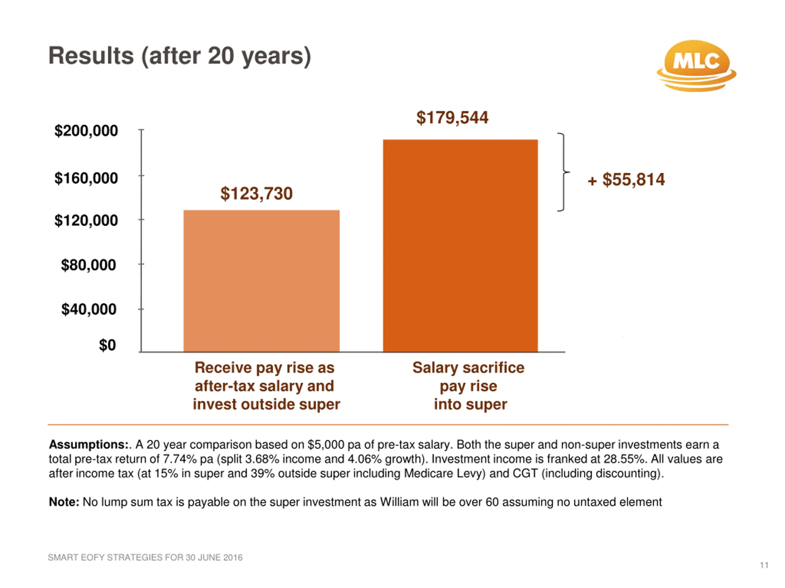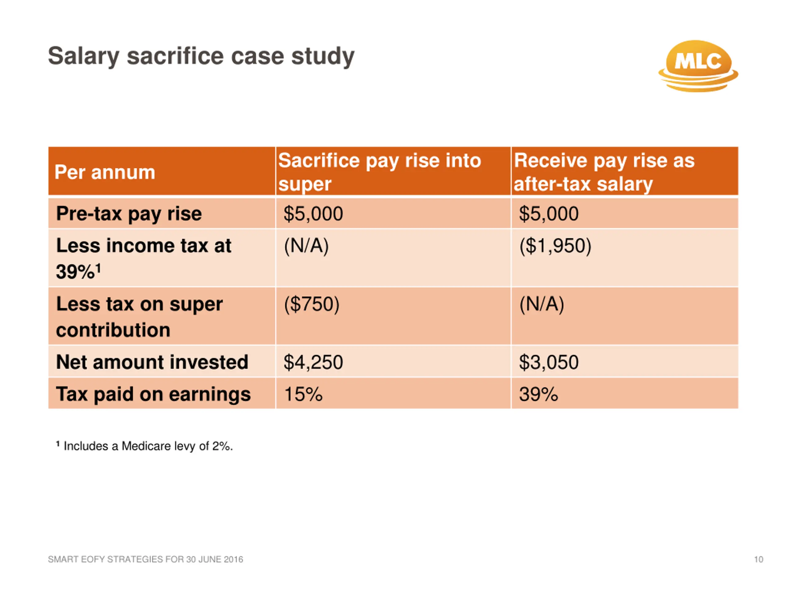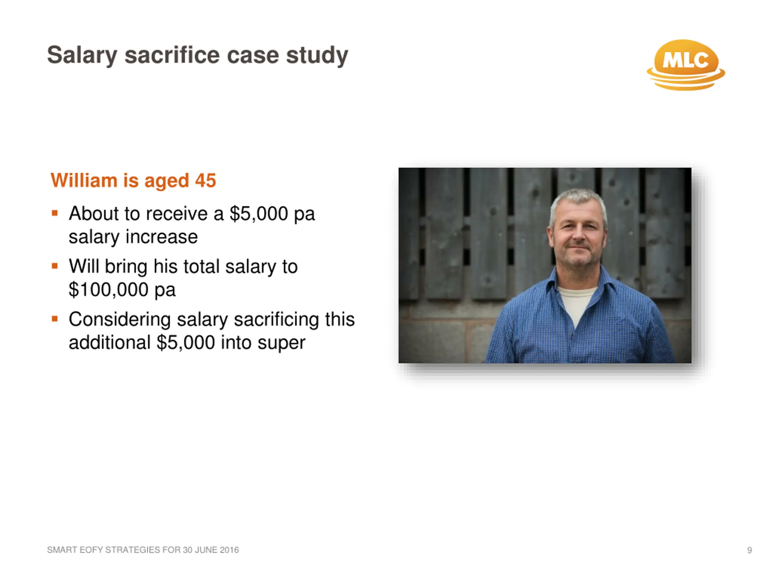 Salary sacrifice case study William is aged 45 About to receive a $5,000 pa salary increase Will bring his total salary to $100,000 pa Considering salary sacrificing this additional $5,000 into super SMART EOFY STRATEGIES FOR 30 JUNE 2016 9