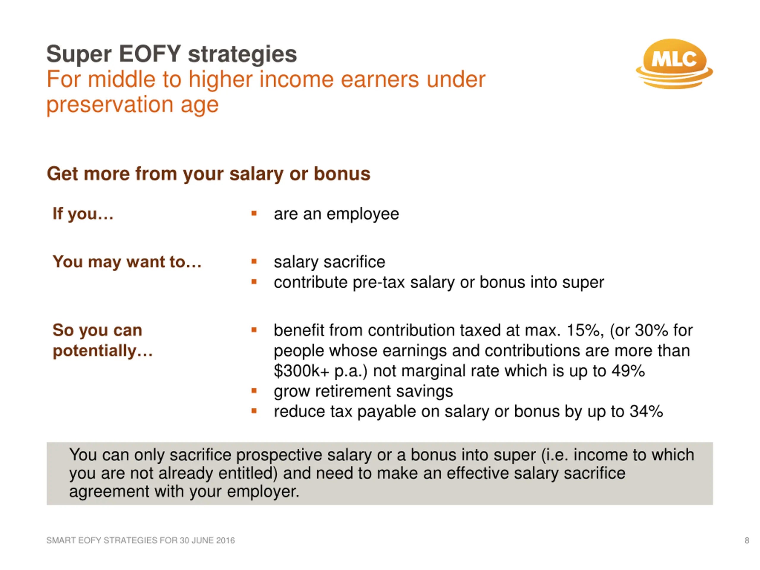 Super EOFY strategies For middle to higher income earners under preservation age Get more from your salary or bonus are an employee If you salary sacrifice contribute pre-tax salary or bonus into super You may want to benefit from contribution taxed at max. 15%, (or 30% for people whose earnings and contributions are more than $300k+ p.a.) not marginal rate which is up to 49% grow retirement savings reduce tax payable on salary or bonus by up to 34% So you can potentially You can only sacrifice prospective salary or a bonus into super (i.e. income to which you are not already entitled) and need to make an effective salary sacrifice agreement with your employer. 8 SMART EOFY STRATEGIES FOR 30 JUNE 2016