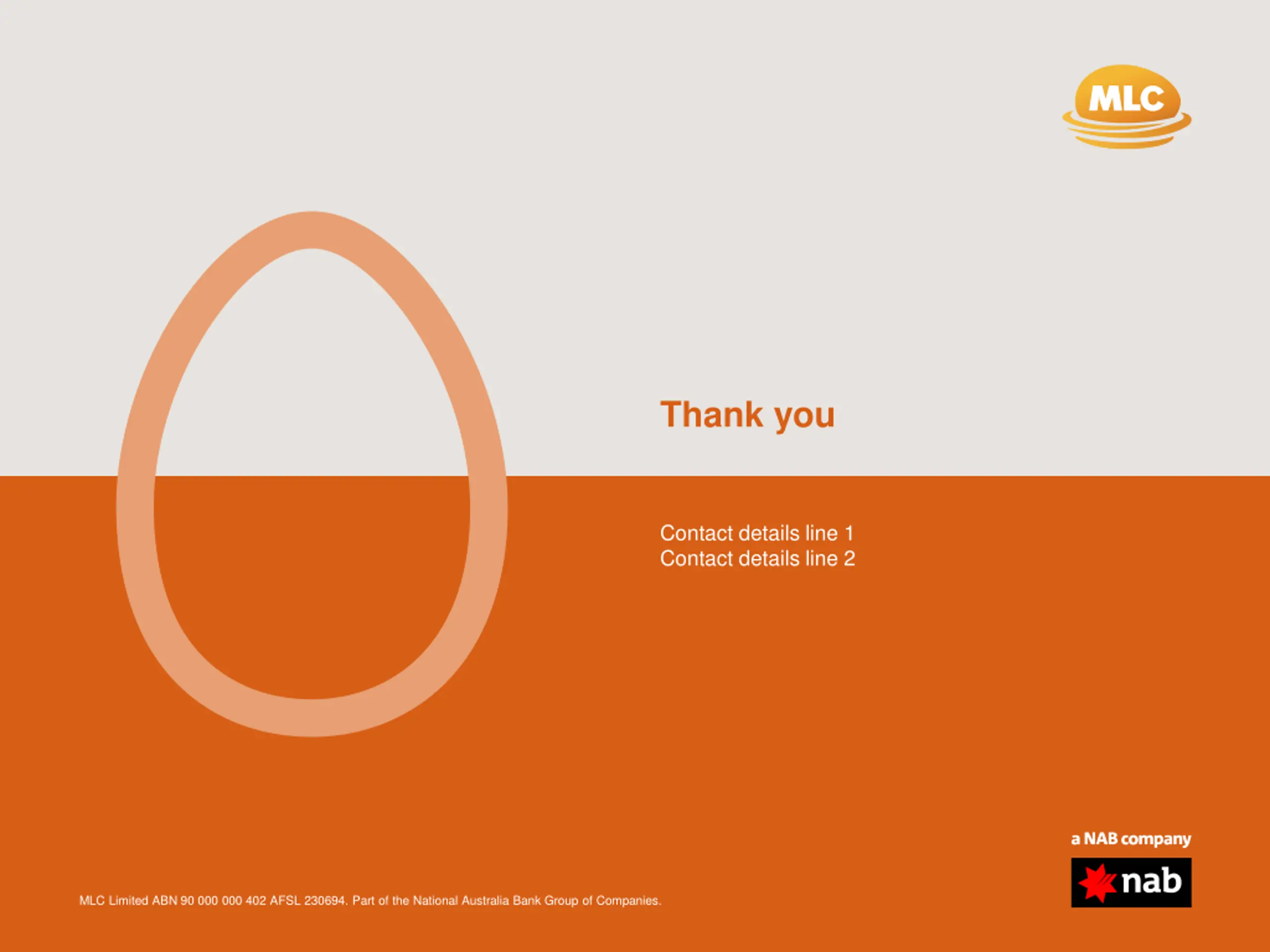 Thank you Contact details line 1 Contact details line 2 MLC Limited ABN 90 000 000 402 AFSL 230694. Part of the National Australia Bank Group of Companies.