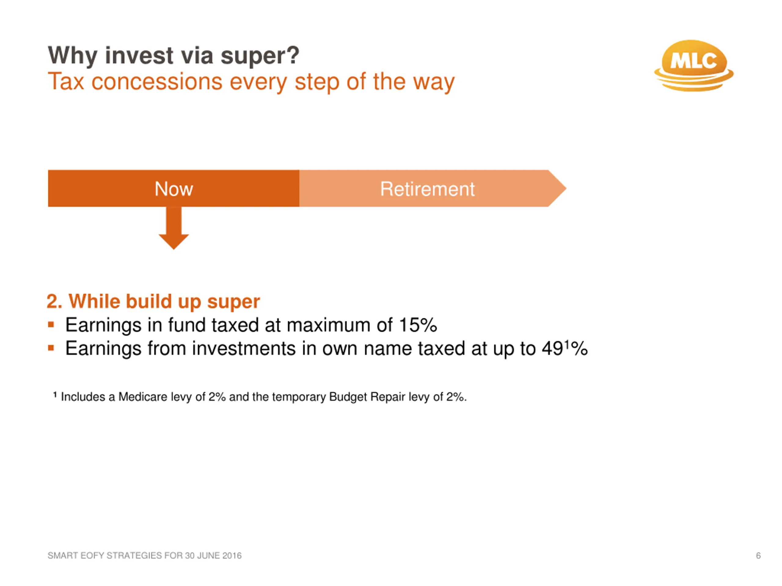 Why invest via super? Tax concessions every step of the way Now Retirement 2. While build up super Earnings in fund taxed at maximum of 15% Earnings from investments in own name taxed at up to 491% 1Includes a Medicare levy of 2% and the temporary Budget Repair levy of 2%. 6 SMART EOFY STRATEGIES FOR 30 JUNE 2016