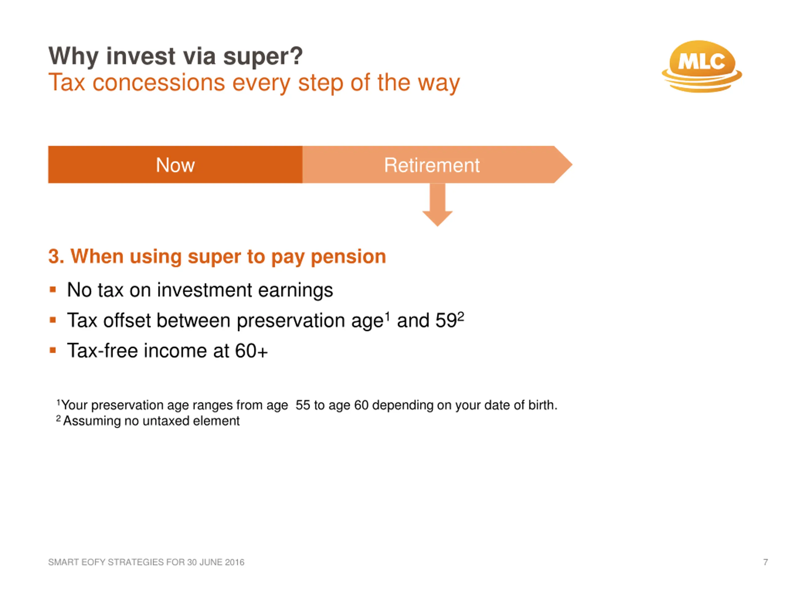 Why invest via super? Tax concessions every step of the way Now Retirement 3. When using super to pay pension No tax on investment earnings Tax offset between preservation age1and 592 Tax-free income at 60+ 1Your preservation age ranges from age 55 to age 60 depending on your date of birth. 2 Assuming no untaxed element 7 SMART EOFY STRATEGIES FOR 30 JUNE 2016