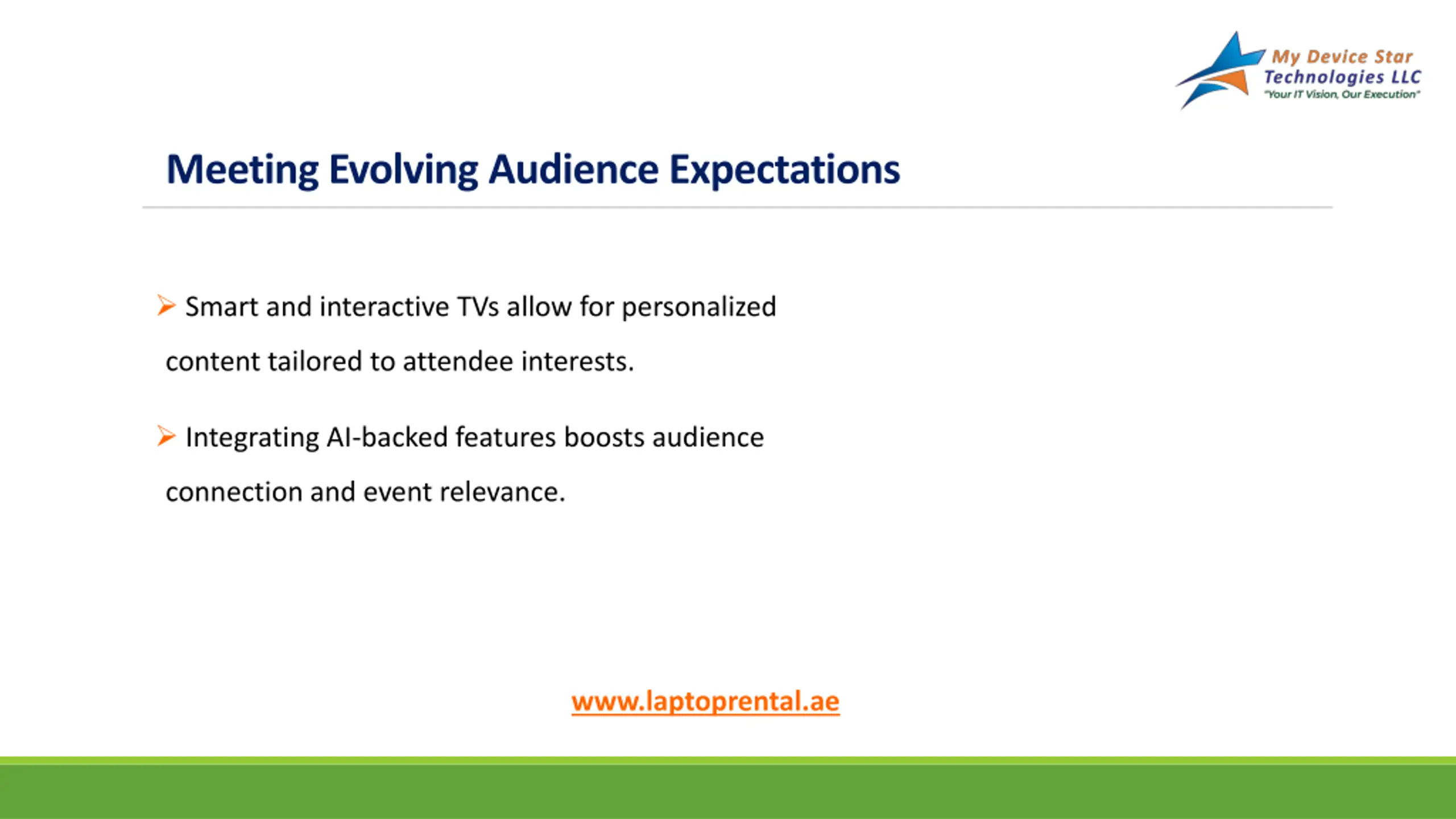 Meeting Evolving Audience Expectations Smart and interactive TVs allow for personalized content tailored to attendee interests. Integrating AI-backed features boosts audience connection and event relevance. www.laptoprental.ae