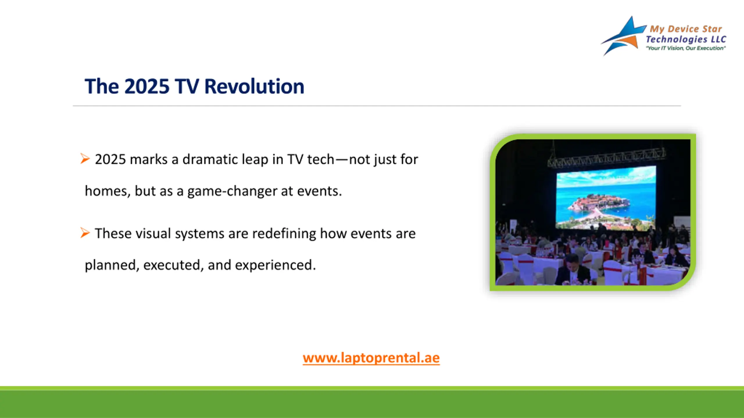 The 2025 TV Revolution TV Rental in UAE 2025 marks a dramatic leap in TV tech not just for homes, but as a game-changer at events. These visual systems are redefining how events are planned, executed, and experienced. www.laptoprental.ae