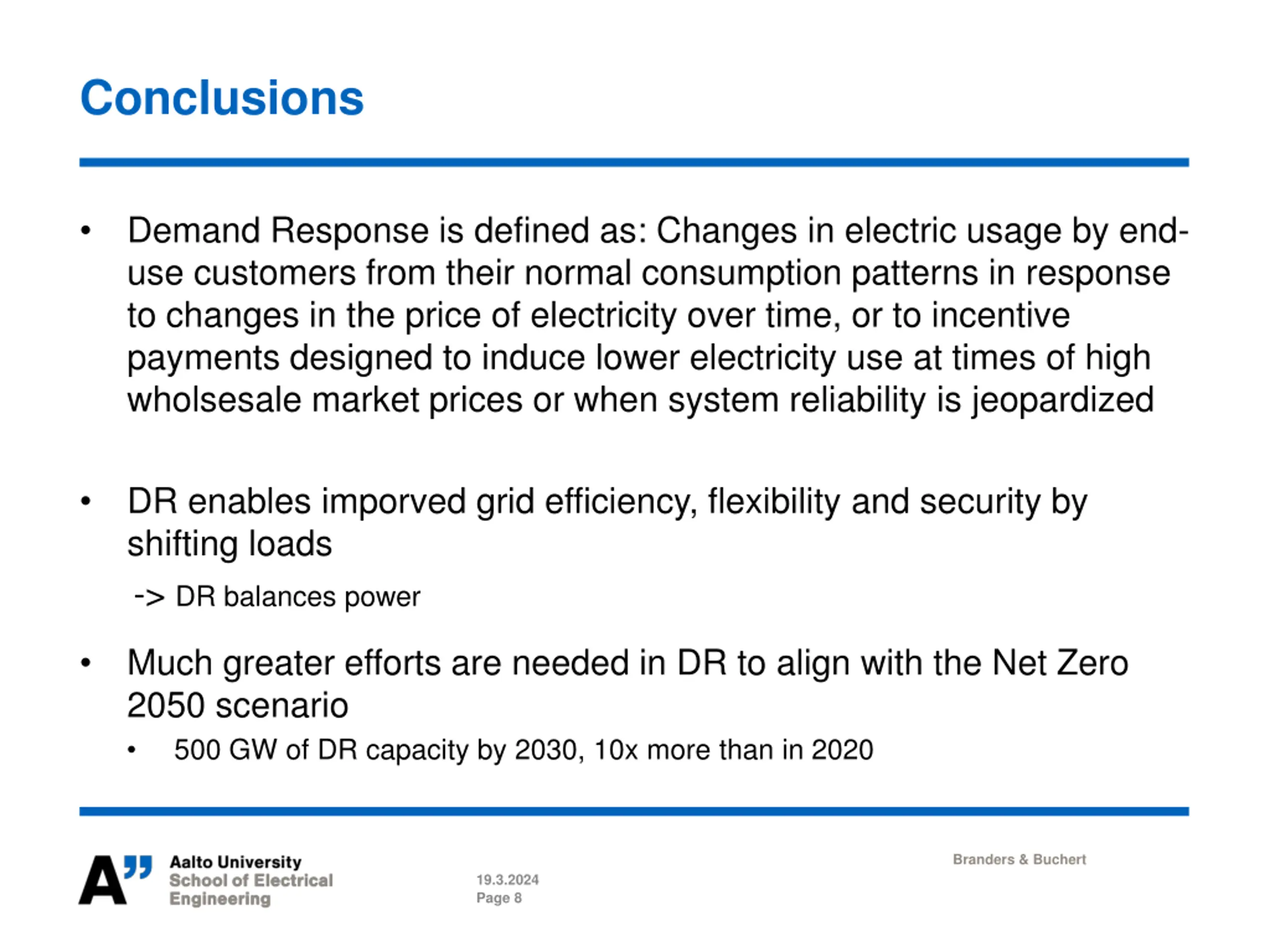 Conclusions Demand Response is defined as: Changes in electric usage by end- use customers from their normal consumption patterns in response to changes in the price of electricity over time, or to incentive payments designed to induce lower electricity use at times of high wholsesale market prices or when system reliability is jeopardized DR enables imporved grid efficiency, flexibility and security by shifting loads -> DR balances power Much greater efforts are needed in DR to align with the Net Zero 2050 scenario 500 GW of DR capacity by 2030, 10x more than in 2020 Branders & Buchert 19.3.2024 Page 8