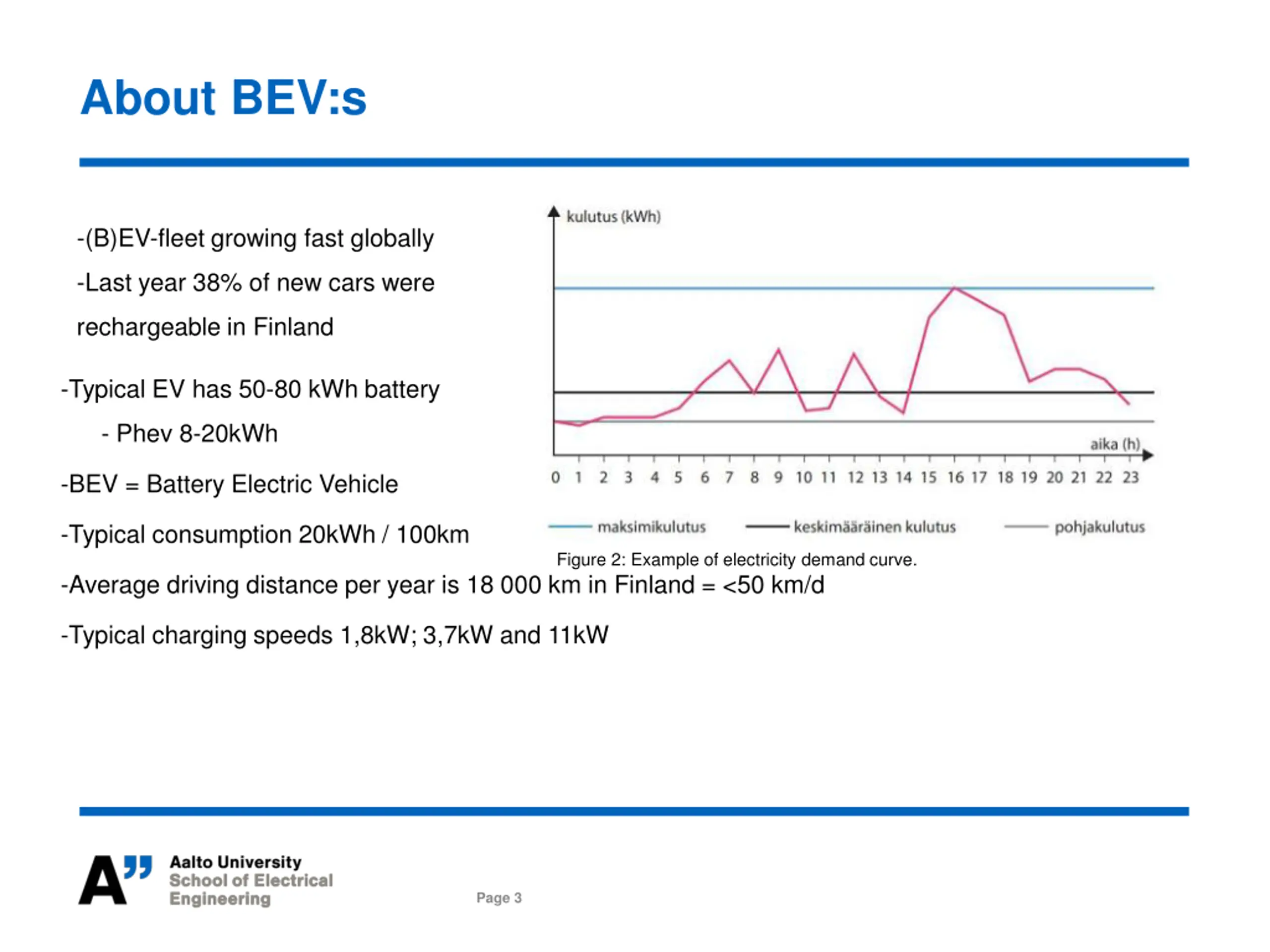 Introduction Demand response (DR) = consumption management to achieve equilibrium in power system Rapid growth in EVs will increase storage capacity connected to power system Potential to utilize as peak load reserve Utilization of DR on EV loads still in pre-mature stage in a large scale Large scale business model and customer incentives require development Figure 1: Illustration of Smart Grid Key terms: Battery Electric Vehicle (BEV), Plug-in Hybrid Vehicle (PHEV), Vehicle to Grid (V2G), Smart Charging 07.02.2018 Page 2
