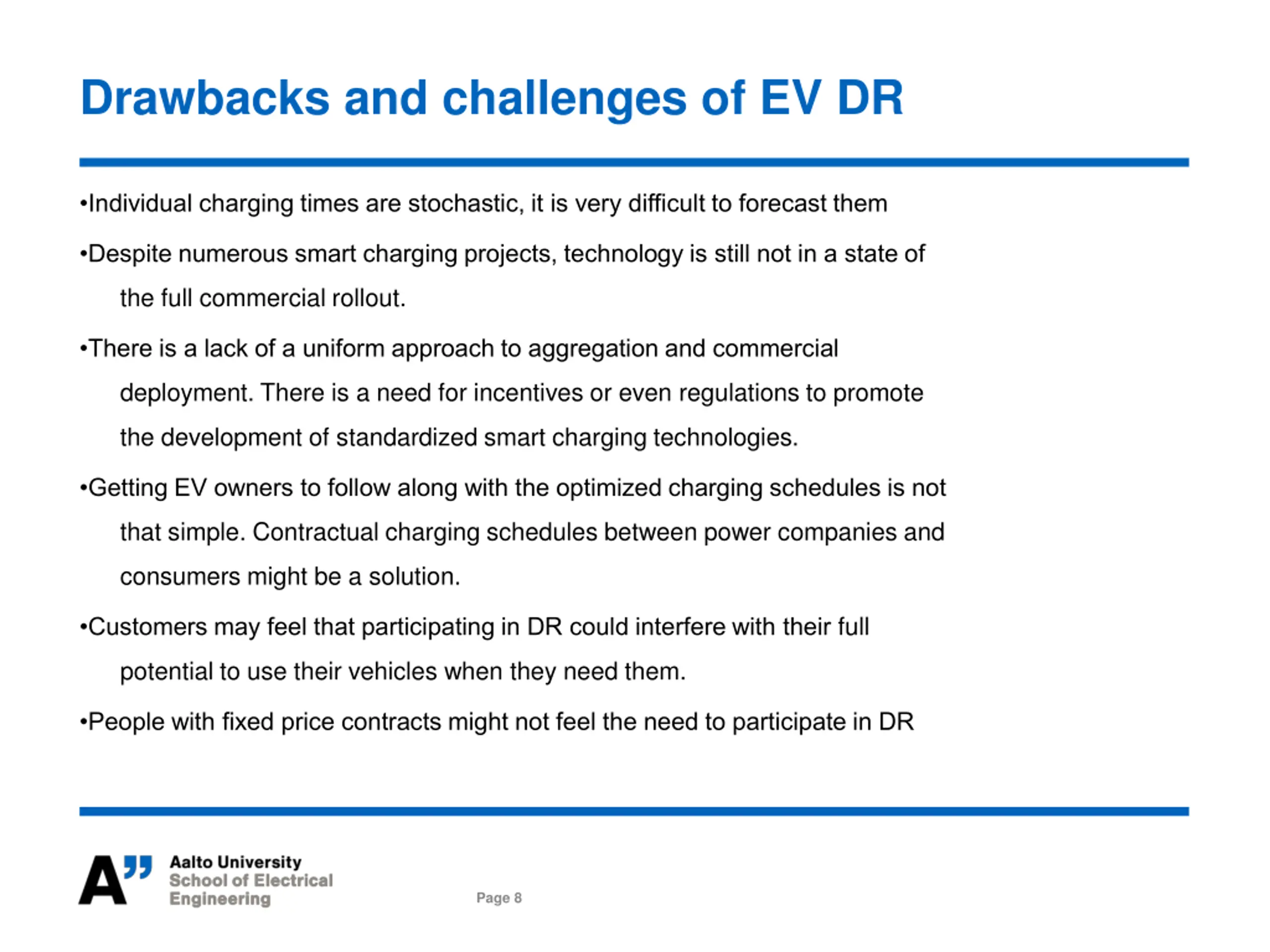 Drawbacks and challenges of EV DR Individual charging times are stochastic, it is very difficult to forecast them Despite numerous smart charging projects, technology is still not in a state of the full commercial rollout. There is a lack of a uniform approach to aggregation and commercial deployment. There is a need for incentives or even regulations to promote the development of standardized smart charging technologies. Getting EV owners to follow along with the optimized charging schedules is not that simple. Contractual charging schedules between power companies and consumers might be a solution. Customers may feel that participating in DR could interfere with their full potential to use their vehicles when they need them. People with fixed price contracts might not feel the need to participate in DR 07.02.2018 Page 8