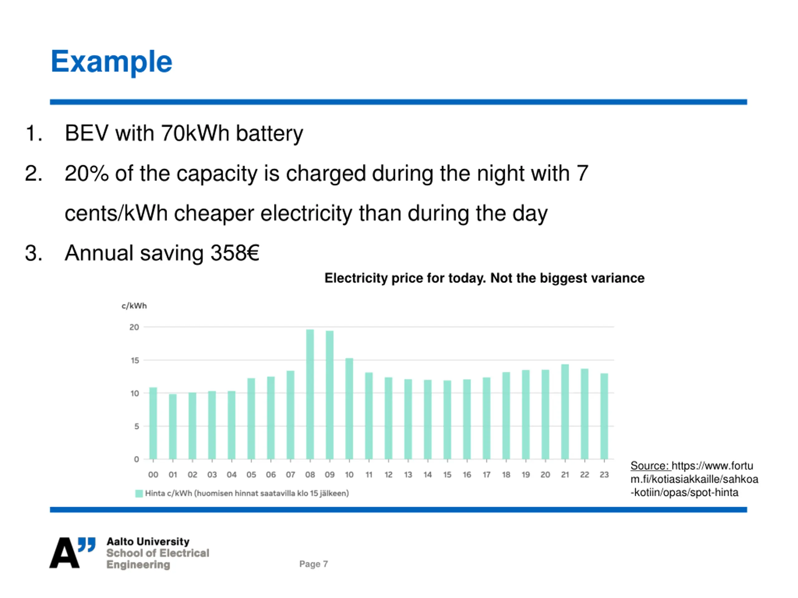 Example 1. BEV with 70kWh battery 2. 20% of the capacity is charged during the night with 7 cents/kWh cheaper electricity than during the day 3. Annual saving 358 Electricity price for today. Not the biggest variance Source: https://www.fortu m.fi/kotiasiakkaille/sahkoa -kotiin/opas/spot-hinta 07.02.2018 Page 7