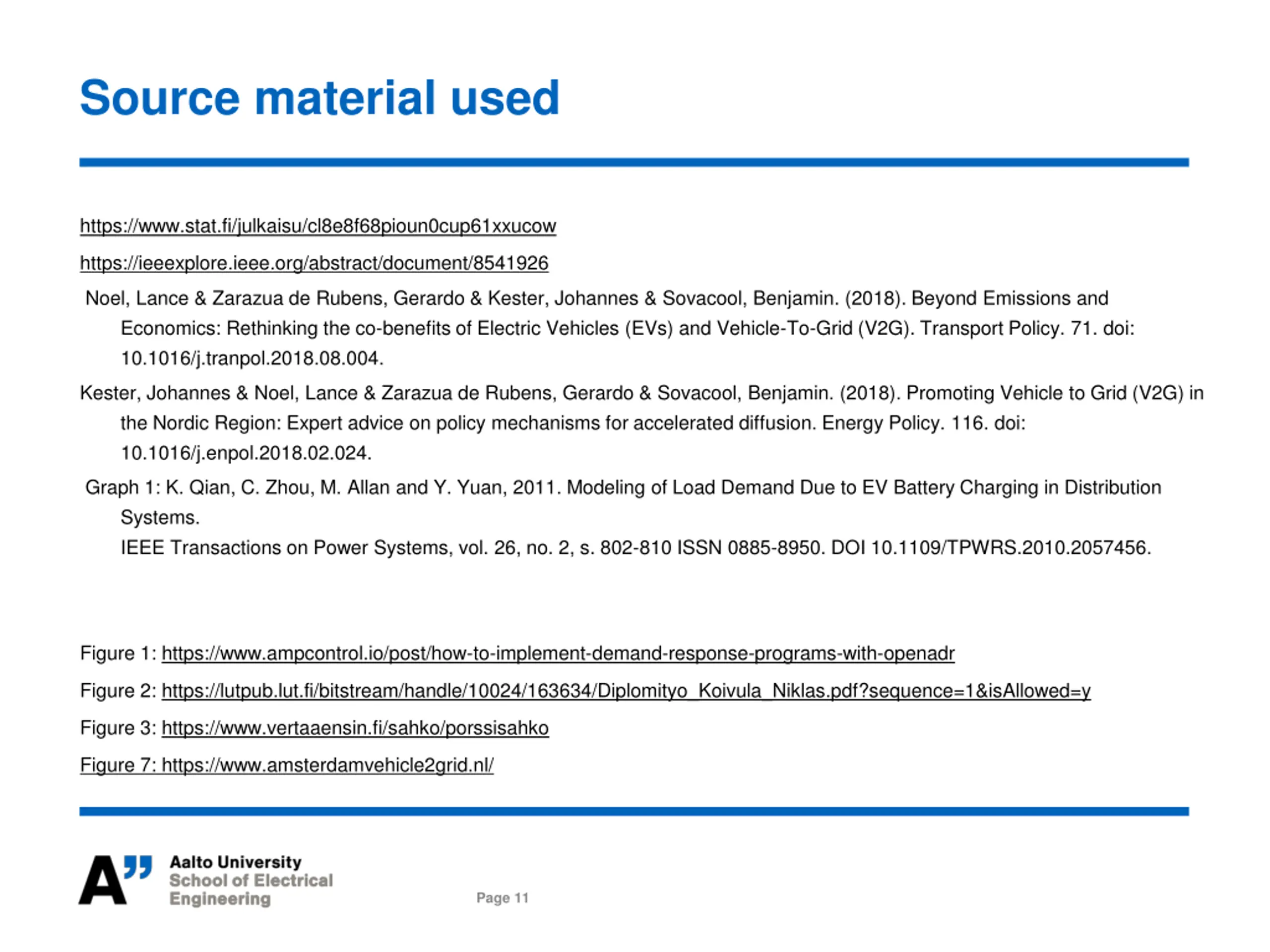 Source material used https://www.stat.fi/julkaisu/cl8e8f68pioun0cup61xxucow https://ieeexplore.ieee.org/abstract/document/8541926 Noel, Lance & Zarazua de Rubens, Gerardo & Kester, Johannes & Sovacool, Benjamin. (2018). Beyond Emissions and Economics: Rethinking the co-benefits of Electric Vehicles (EVs) and Vehicle-To-Grid (V2G). Transport Policy. 71. doi: 10.1016/j.tranpol.2018.08.004. Kester, Johannes & Noel, Lance & Zarazua de Rubens, Gerardo & Sovacool, Benjamin. (2018). Promoting Vehicle to Grid (V2G) in the Nordic Region: Expert advice on policy mechanisms for accelerated diffusion. Energy Policy. 116. doi: 10.1016/j.enpol.2018.02.024. Graph 1: K. Qian, C. Zhou, M. Allan and Y. Yuan, 2011. Modeling of Load Demand Due to EV Battery Charging in Distribution Systems. IEEE Transactions on Power Systems, vol. 26, no. 2, s. 802-810 ISSN 0885-8950. DOI 10.1109/TPWRS.2010.2057456. Figure 1: https://www.ampcontrol.io/post/how-to-implement-demand-response-programs-with-openadr Figure 2: https://lutpub.lut.fi/bitstream/handle/10024/163634/Diplomityo_Koivula_Niklas.pdf?sequence=1&isAllowed=y Figure 3: https://www.vertaaensin.fi/sahko/porssisahko Figure 7: https://www.amsterdamvehicle2grid.nl/ 07.02.2018 Page 11