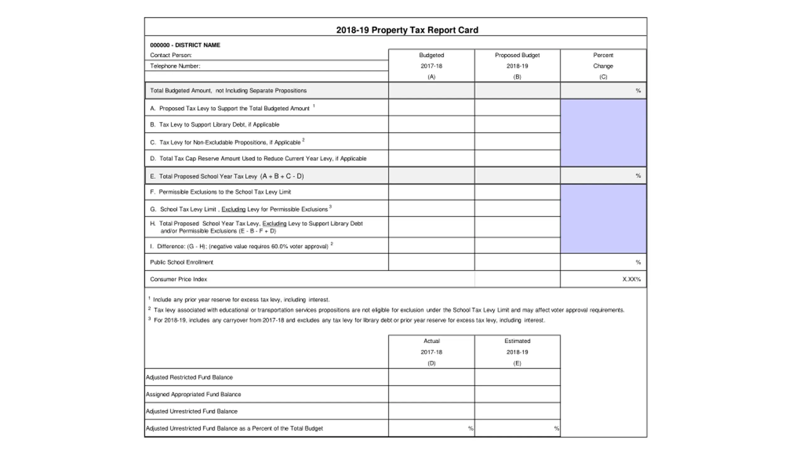 2018-19 Property Tax Report Card 000000 - DISTRICT NAME Contact Person: Budgeted Proposed Budget Percent Telephone Number: 2017-18 2018-19 Change (A) (B) (C) Total Budgeted Amount, not Including Separate Propositions % A. Proposed Tax Levy to Support the Total Budgeted Amount 1 B. Tax Levy to Support Library Debt, if Applicable C. Tax Levy for Non-Excludable Propositions, if Applicable 2 D. Total Tax Cap Reserve Amount Used to Reduce Current Year Levy, if Applicable E. Total Proposed School Year Tax Levy (A + B + C - D) % F. Permissible Exclusions to the School Tax Levy Limit G. School Tax Levy Limit , Excluding Levy for Permissible Exclusions 3 H. Total Proposed School Year Tax Levy, Excluding Levy to Support Library Debt and/or Permissible Exclusions (E - B - F + D) I. Difference: (G - H); (negative value requires 60.0% voter approval)2 Public School Enrollment % Consumer Price Index X.XX% 1 Include any prior year reserve for excess tax levy, including interest. 2Tax levy associated with educational or transportation services propositions are not eligible for exclusion under the School Tax Levy Limit and may affect voter approval requirements. 3For 2018-19, includes any carryover from 2017-18 and excludes any tax levy for library debt or prior year reserve for excess tax levy, including interest. Actual Estimated 2017-18 2018-19 (D) (E) Adjusted Restricted Fund Balance Assigned Appropriated Fund Balance Adjusted Unrestricted Fund Balance Adjusted Unrestricted Fund Balance as a Percent of the Total Budget % %