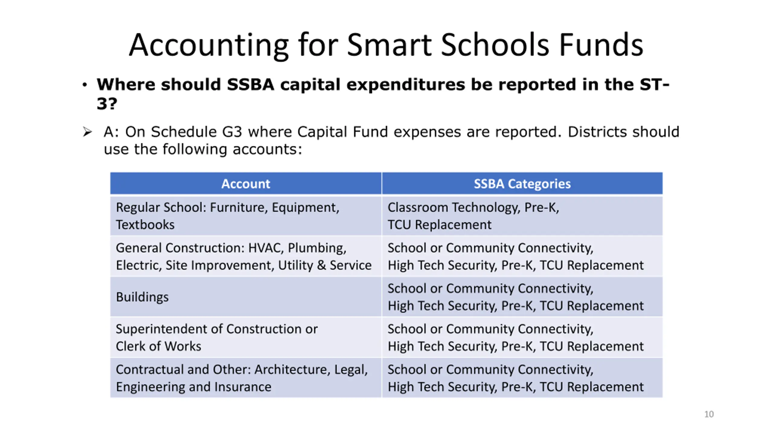 Accounting for Smart Schools Funds Where should SSBA capital expenditures be reported in the ST- 3? A: On Schedule G3 where Capital Fund expenses are reported. Districts should use the following accounts: Account SSBA Categories Regular School: Furniture, Equipment, Textbooks Classroom Technology, Pre-K, TCU Replacement General Construction: HVAC, Plumbing, Electric, Site Improvement, Utility & Service School or Community Connectivity, High Tech Security, Pre-K, TCU Replacement School or Community Connectivity, High Tech Security, Pre-K, TCU Replacement Buildings Superintendent of Construction or Clerk of Works School or Community Connectivity, High Tech Security, Pre-K, TCU Replacement Contractual and Other: Architecture, Legal, Engineering and Insurance School or Community Connectivity, High Tech Security, Pre-K, TCU Replacement 10