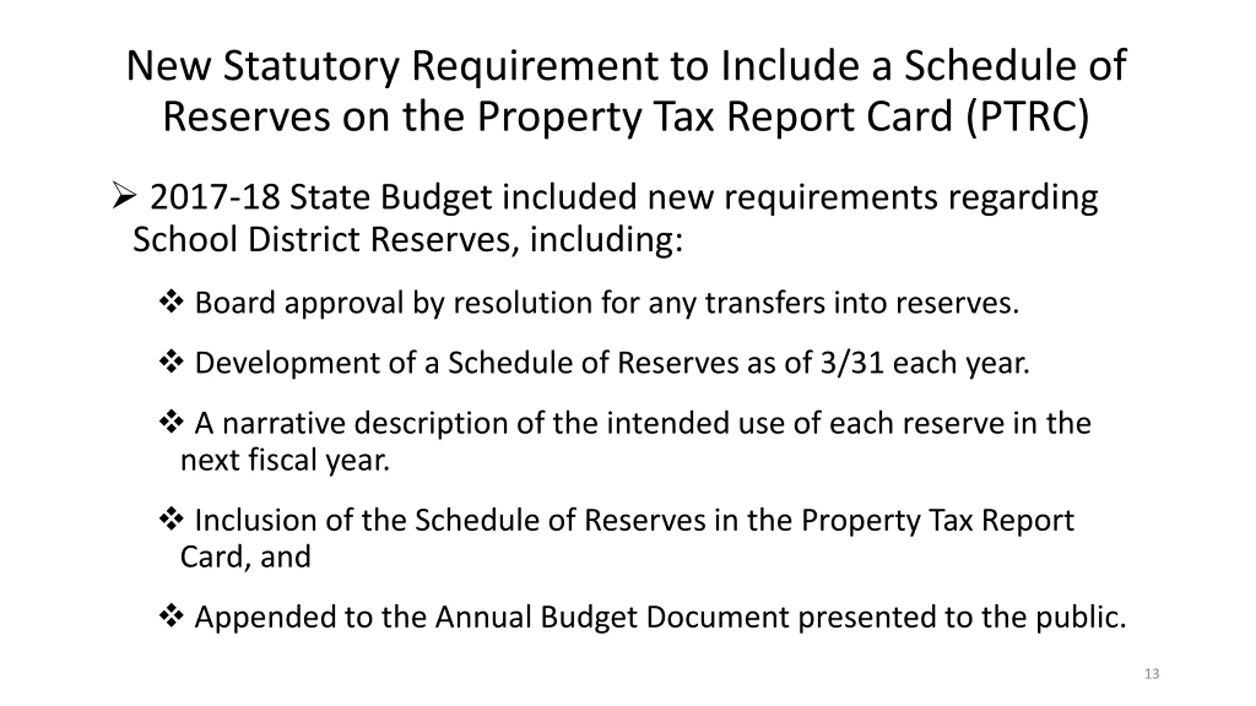 New Statutory Requirement to Include a Schedule of Reserves on the Property Tax Report Card (PTRC) 2017-18 State Budget included new requirements regarding School District Reserves, including: Board approval by resolution for any transfers into reserves. Development of a Schedule of Reserves as of 3/31 each year. A narrative description of the intended use of each reserve in the next fiscal year. Inclusion of the Schedule of Reserves in the Property Tax Report Card, and Appended to the Annual Budget Document presented to the public. 13