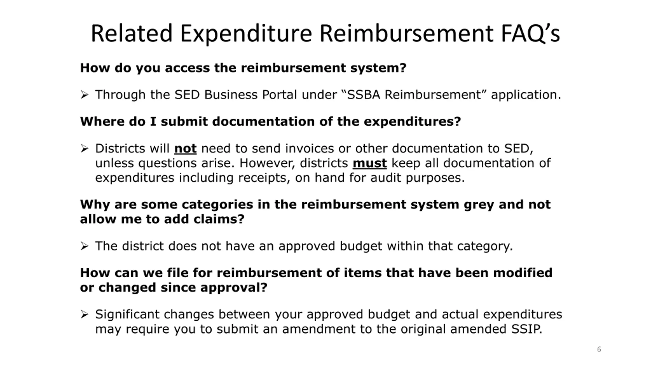 Related Expenditure Reimbursement FAQs How do you access the reimbursement system? Through the SED Business Portal under SSBA Reimbursement application. Where do I submit documentation of the expenditures? Districts will not need to send invoices or other documentation to SED, unless questions arise. However, districts must keep all documentation of expenditures including receipts, on hand for audit purposes. Why are some categories in the reimbursement system grey and not allow me to add claims? The district does not have an approved budget within that category. How can we file for reimbursement of items that have been modified or changed since approval? Significant changes between your approved budget and actual expenditures may require you to submit an amendment to the original amended SSIP. 6