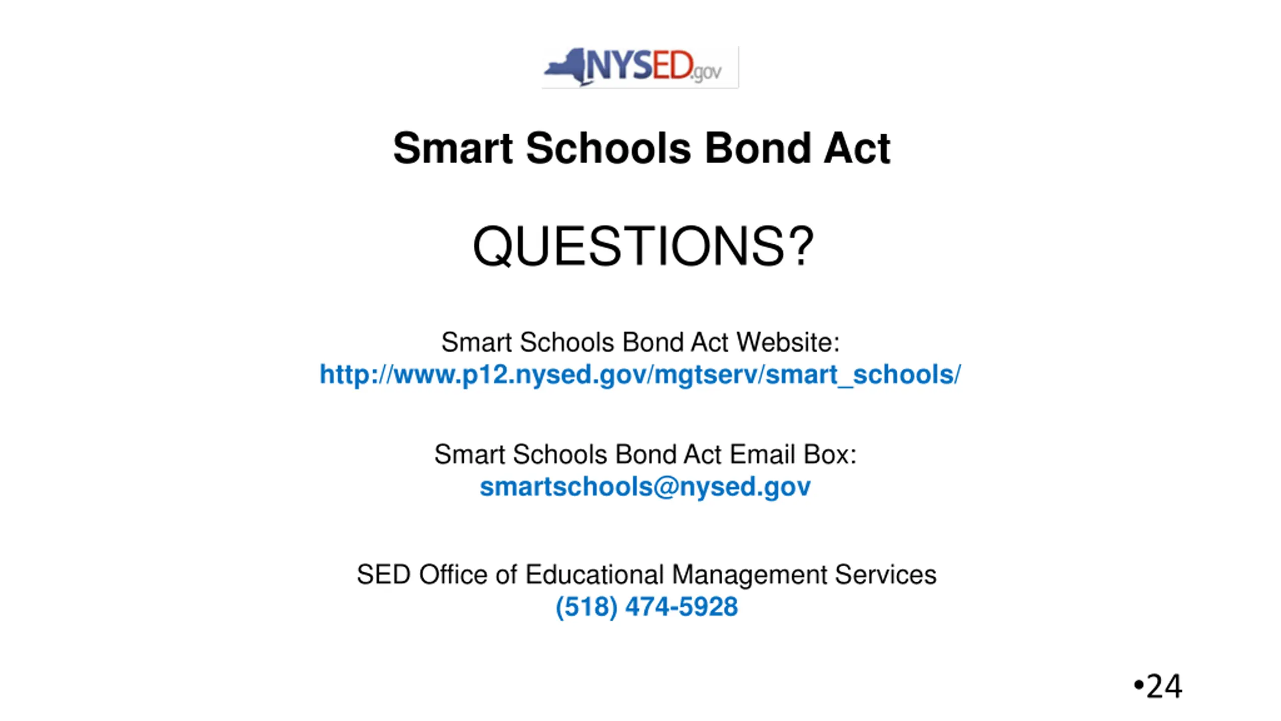 Smart Schools Bond Act QUESTIONS? Smart Schools Bond Act Website: http://www.p12.nysed.gov/mgtserv/smart_schools/ Smart Schools Bond Act Email Box: smartschools@nysed.gov SED Office of Educational Management Services (518) 474-5928 24