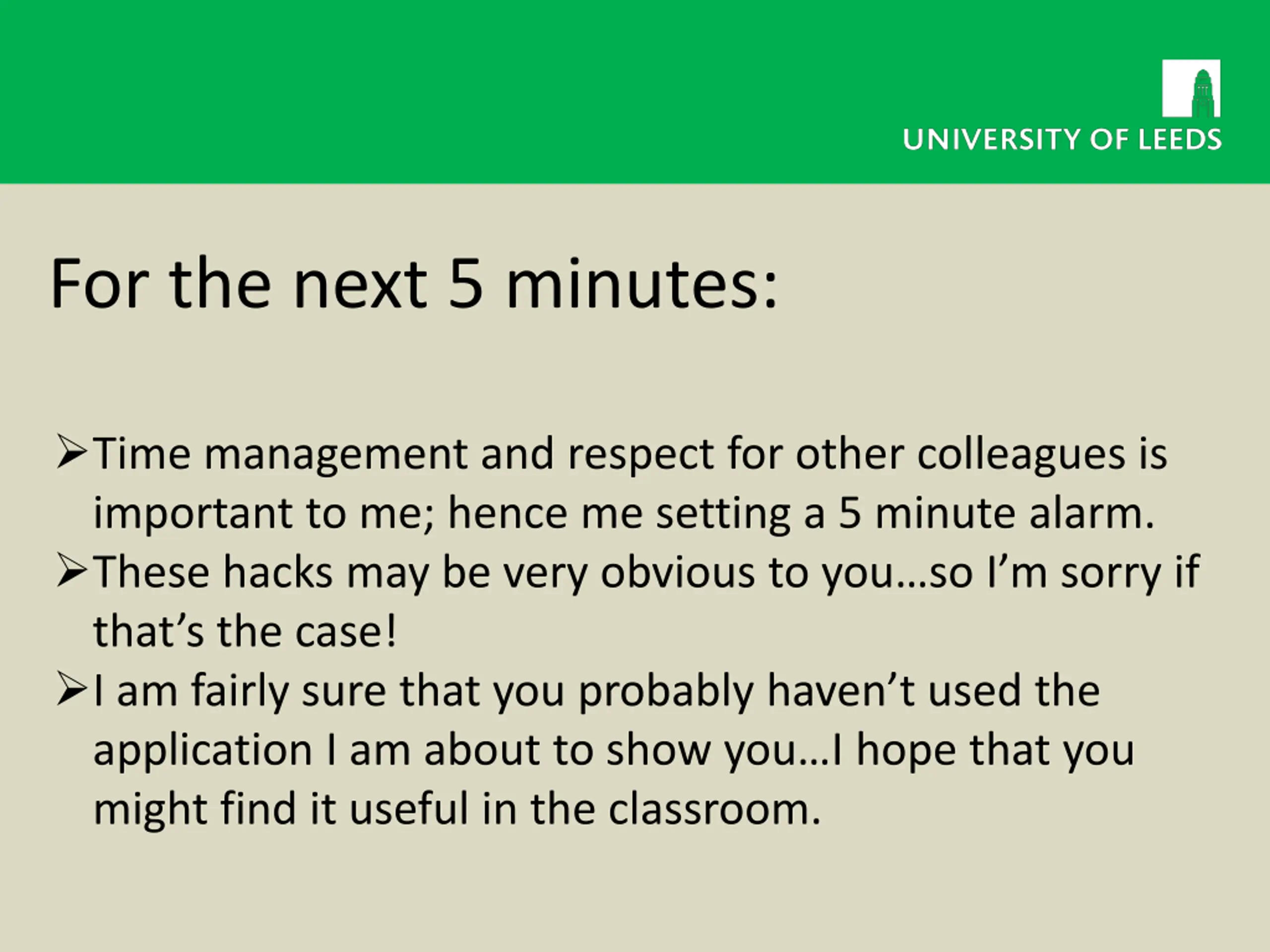 For the next 5 minutes: Time management and respect for other colleagues is important to me; hence me setting a 5 minute alarm. These hacks may be very obvious to you so I m sorry if that s the case! I am fairly sure that you probably haven t used the application I am about to show you I hope that you might find it useful in the classroom.