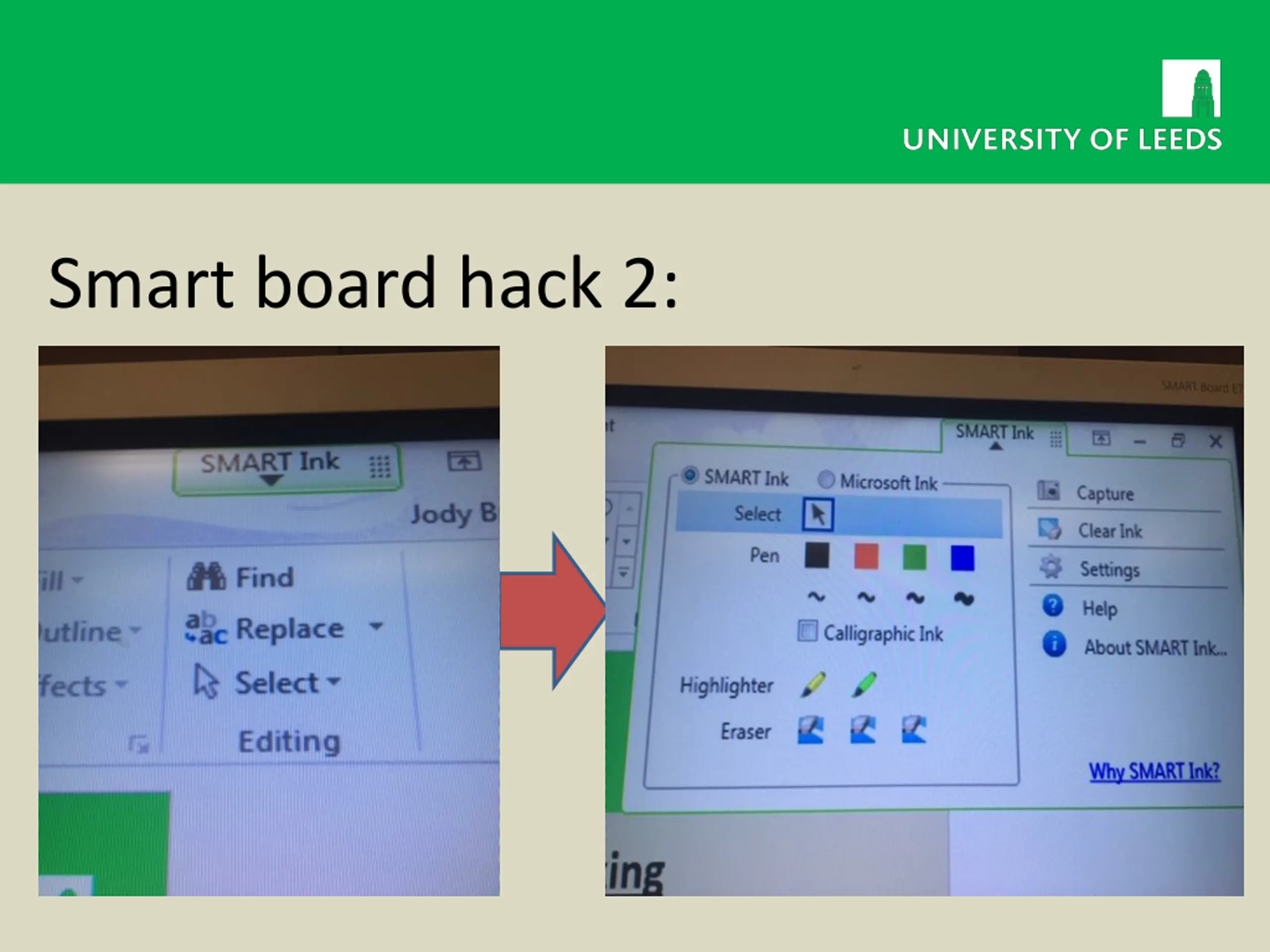 Smart board hack 1: Help! I can see there is a smartboard in my room but I can t use the pens! Try: