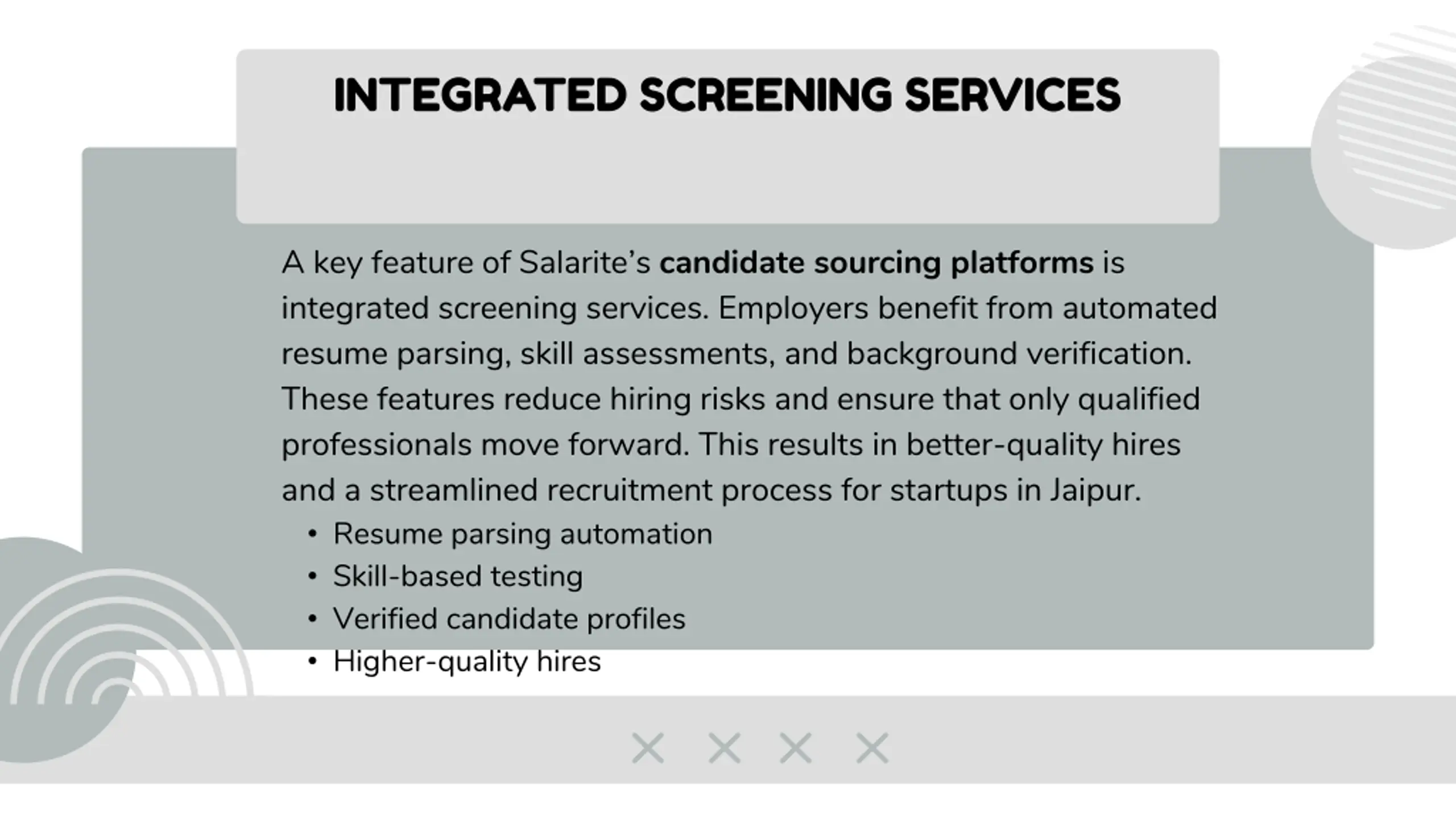 INTEGRATED SCREENING SERVICES A key feature of Salarite s candidate sourcing platforms is integrated screening services. Employers benefit from automated resume parsing, skill assessments, and background verification. These features reduce hiring risks and ensure that only qualified professionals move forward. This results in better-quality hires and a streamlined recruitment process for startups in Jaipur. Resume parsing automation Skill-based testing Verified candidate profiles Higher-quality hires