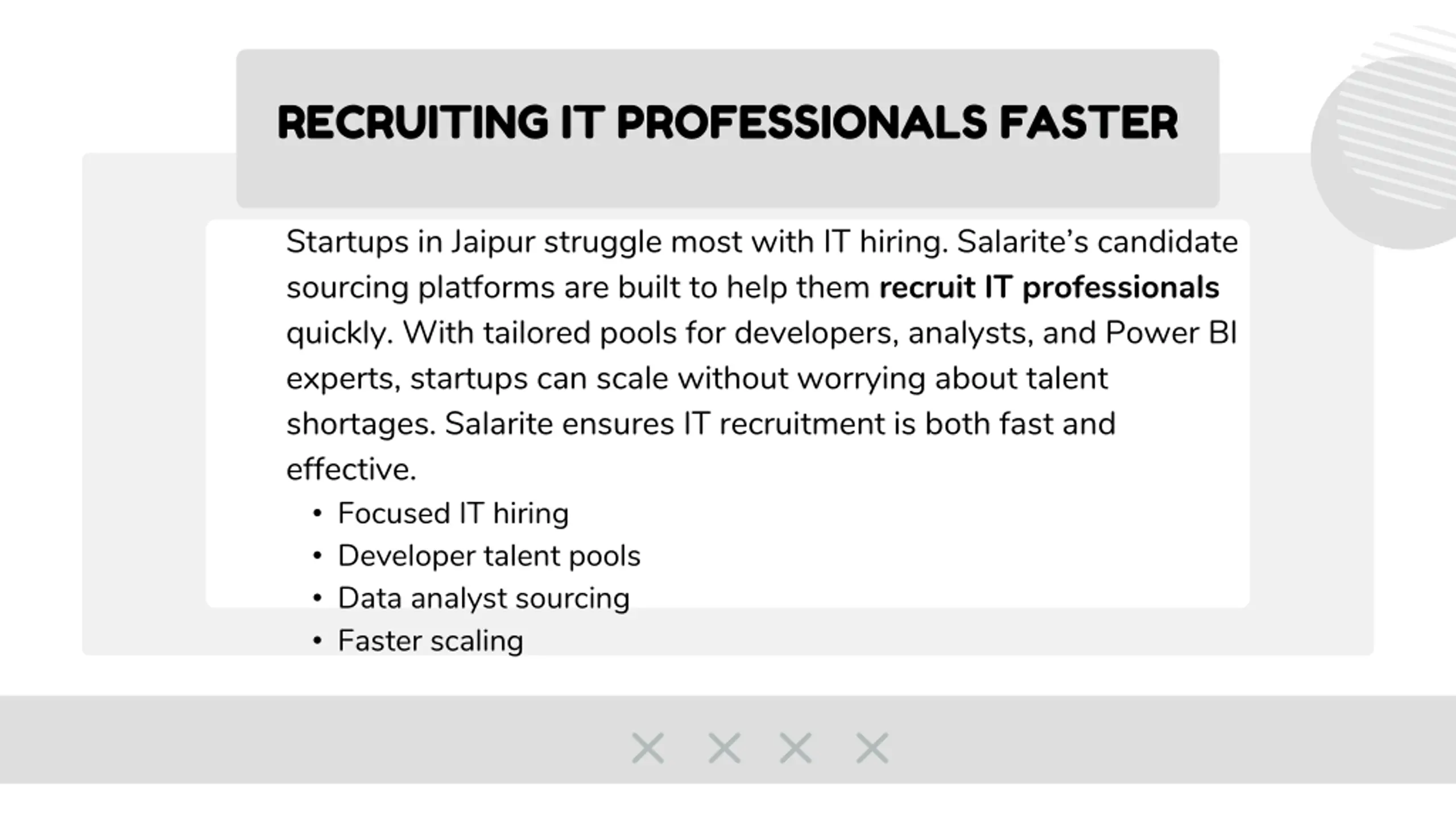 RECRUITING IT PROFESSIONALS FASTER Startups in Jaipur struggle most with IT hiring. Salarite s candidate sourcing platforms are built to help them recruit IT professionals quickly. With tailored pools for developers, analysts, and Power BI experts, startups can scale without worrying about talent shortages. Salarite ensures IT recruitment is both fast and effective. Focused IT hiring Developer talent pools Data analyst sourcing Faster scaling