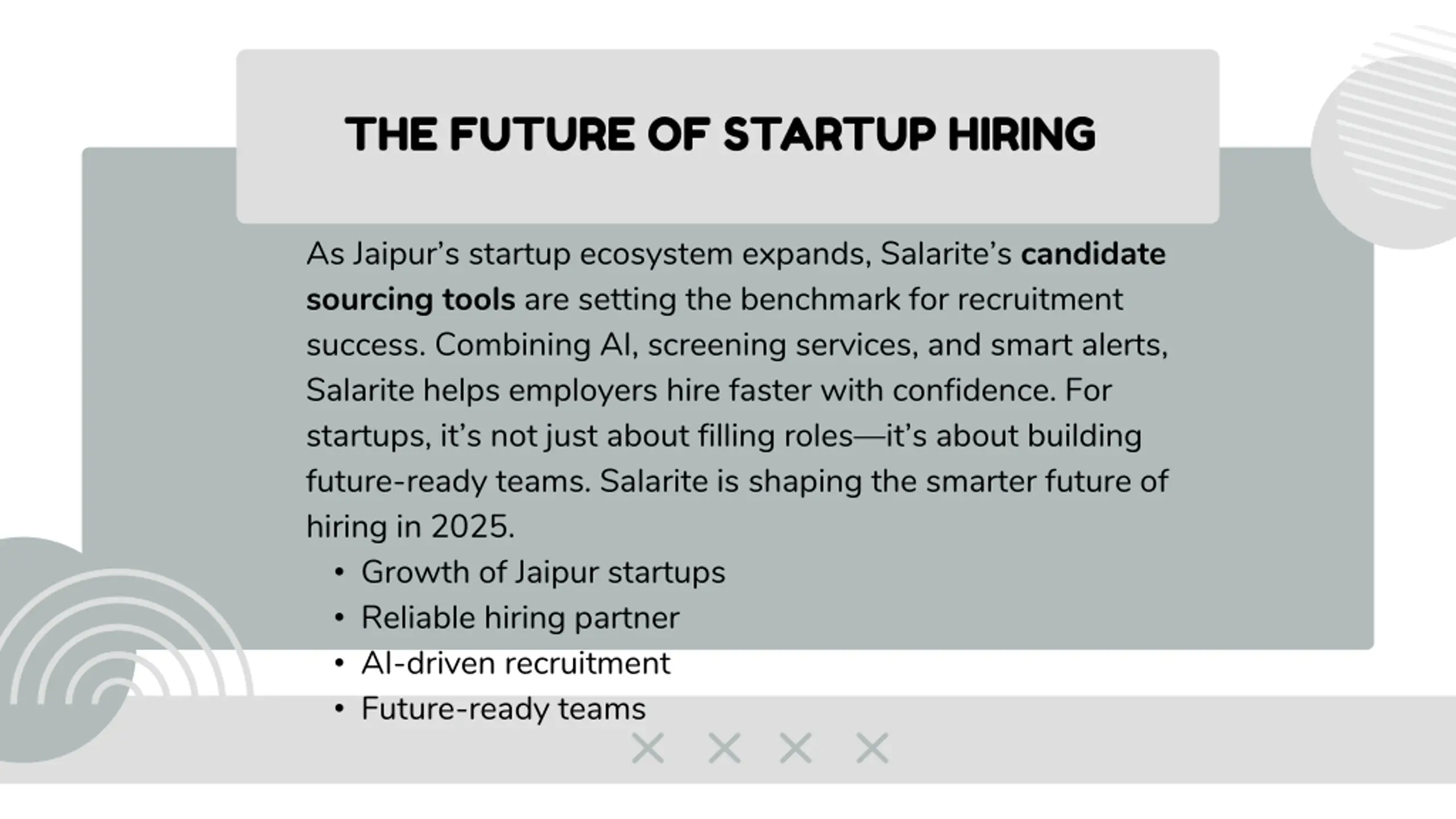 THE FUTURE OF STARTUP HIRING As Jaipur s startup ecosystem expands, Salarite s candidate sourcing tools are setting the benchmark for recruitment success. Combining AI, screening services, and smart alerts, Salarite helps employers hire faster with confidence. For startups, it s not just about filling roles it s about building future-ready teams. Salarite is shaping the smarter future of hiring in 2025. Growth of Jaipur startups Reliable hiring partner AI-driven recruitment Future-ready teams