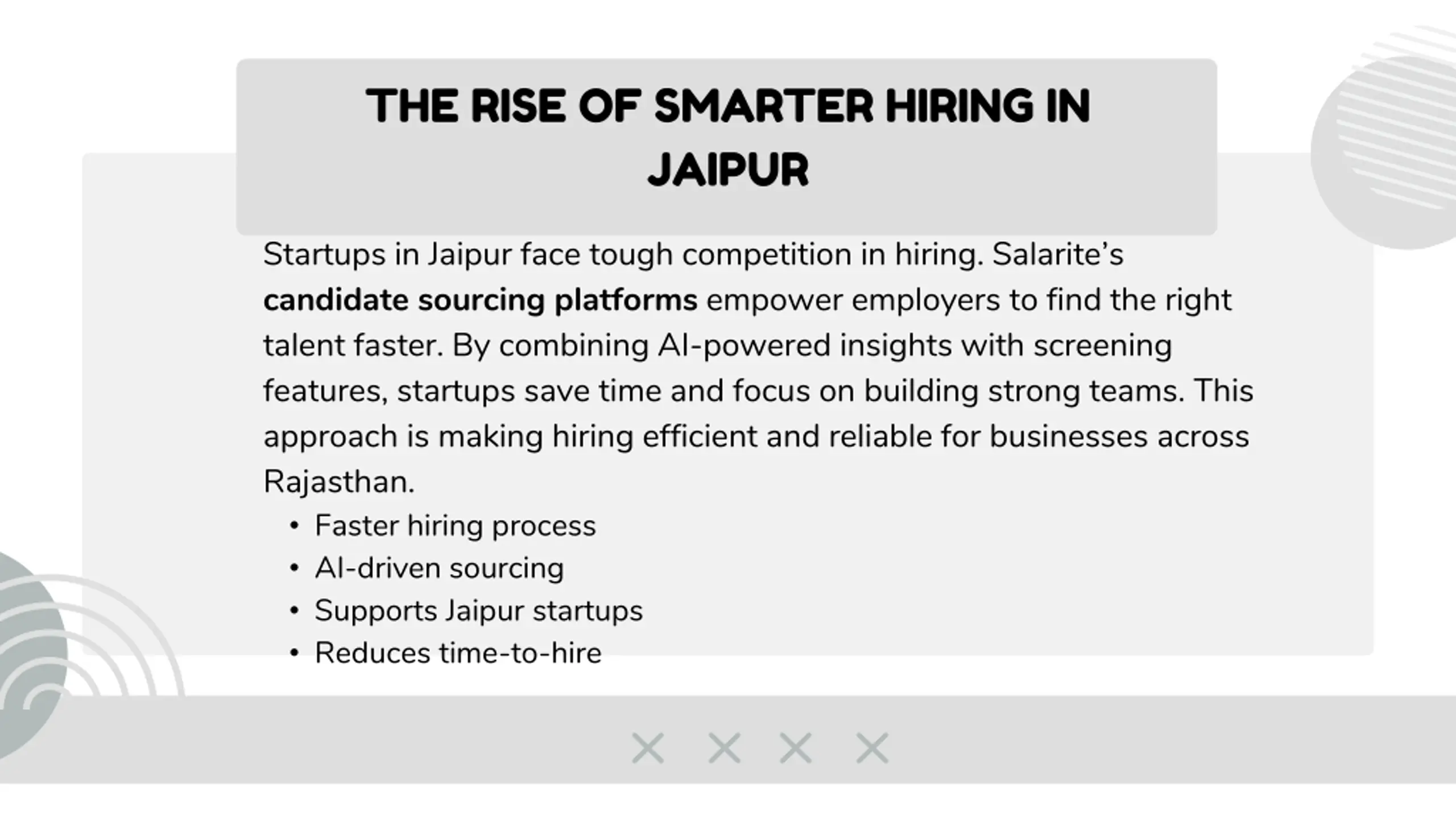 THE RISE OF SMARTER HIRING IN JAIPUR Startups in Jaipur face tough competition in hiring. Salarite s candidate sourcing platforms empower employers to find the right talent faster. By combining AI-powered insights with screening features, startups save time and focus on building strong teams. This approach is making hiring efficient and reliable for businesses across Rajasthan. Faster hiring process AI-driven sourcing Supports Jaipur startups Reduces time-to-hire